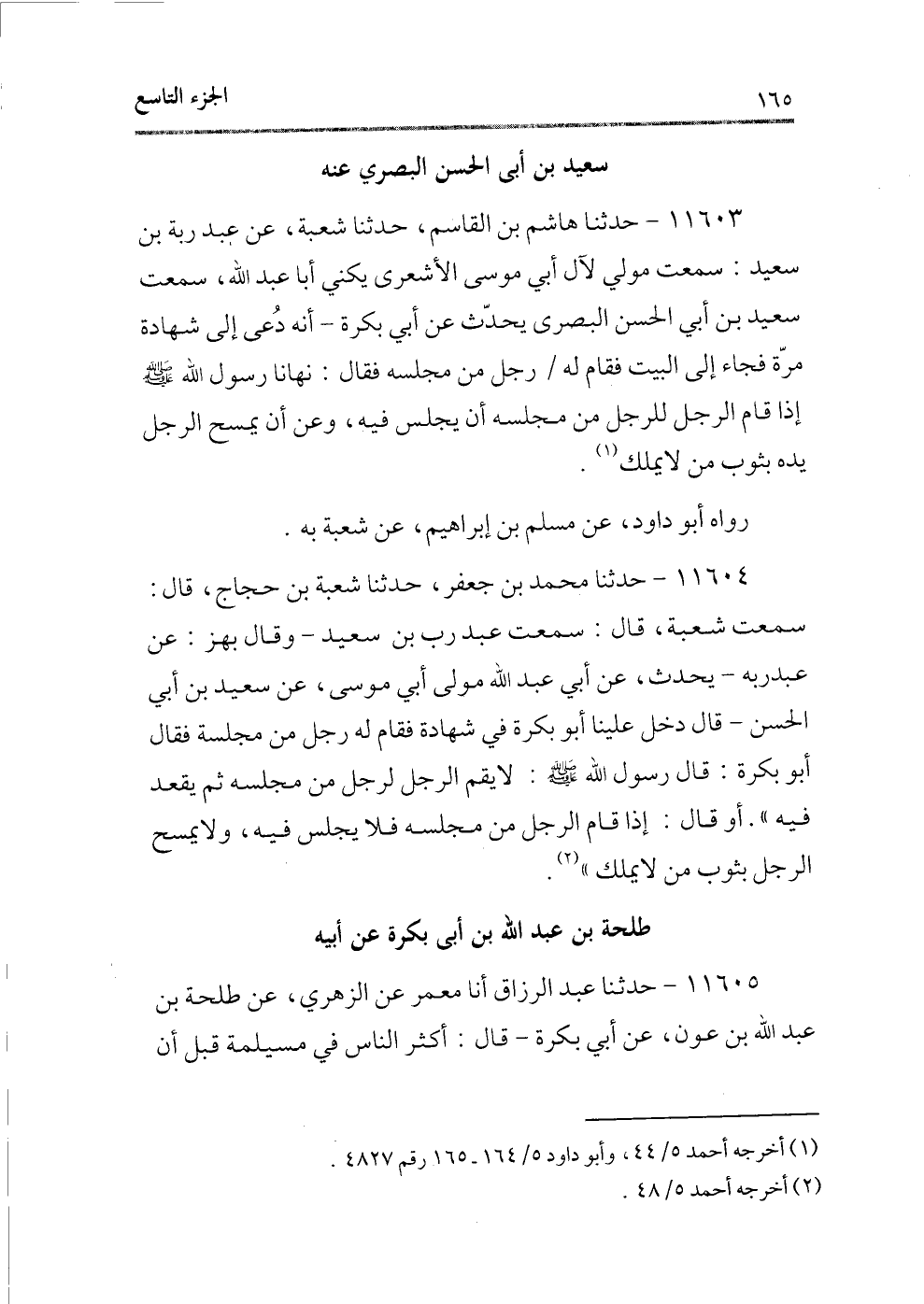 11604 - حدثنا محمد بن جعفر، حدثنا شعبة بن حجاج، قال: سمعت شعبة، قال: سمعت عبد رب بن سعيد ـ وقال بهز: عن عبد ربه ـ يحدث، عن أبى عبد الله مولى أبى موسى، عن سعيد بن أبى الحسن ـ قال دخل علينا أبو بكرة فى شهادة فقام له رجل من مجلسه فقال أبو بكرة: قال رسول الله - صلى الله عليه وسلم -: «لا يقم الرجل لرجل من مجلسه ثم يقعد فيه» . أو قال: «إذا قام الرجل من مجلسه فلا يجلس فيه، ولا يمسح الرجل بثوب من لا يملك» (¬2) .