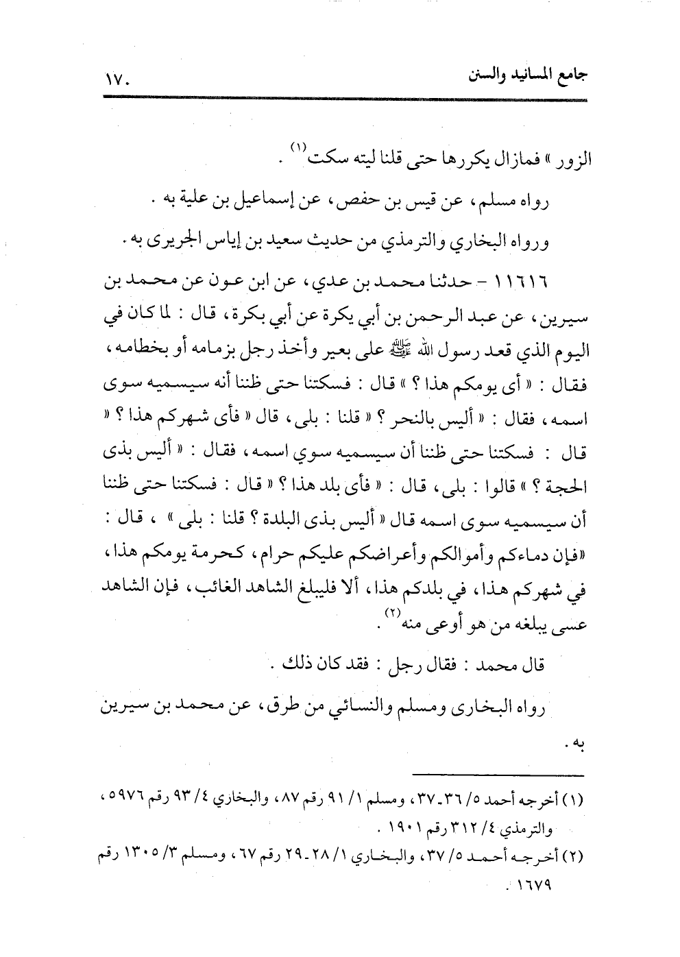 11616 - حدثنا محمد بن عدى، عن ابن عون عن محمد بن سيرين، عن عبد الرحمن بن أبى يكرة عن أبى بكرة، قال: لما كان فى اليوم الذى قعد رسول الله - صلى الله عليه وسلم - على بعير وأخذ رجل بزمامه أو بخطامه، فقال: «أى يومكم هذا؟» قال: فسكتنا حتى ظننا أنه سيسميه سوى اسمه، فقال: «أليس بالنحر؟» قلنا: بلى، قال «فأى شهركم هذا؟» قال: فسكتنا حتى ظننا أنه سيسميه سوى اسمه، قال: «أليس بذى الحجة؟» قالوا: بلى، قال: «فأى بلد هذا؟» قال: فسكتنا حتى ظننا أنه سيسميه سوى أسمه قال «أليس بذى البلدة؟» قلنا: بلى، قال: «فإن دماؤكم وأموالكم وأعراضكم عليكم حرام، كحرمة يومكم هذا، فى شهركم هذا، فى بلدكم هذا، ألا فليبلغ الشاهد الغائب، فإن الشاهد عسى يبلغه من هو أوعى منه (¬1) .