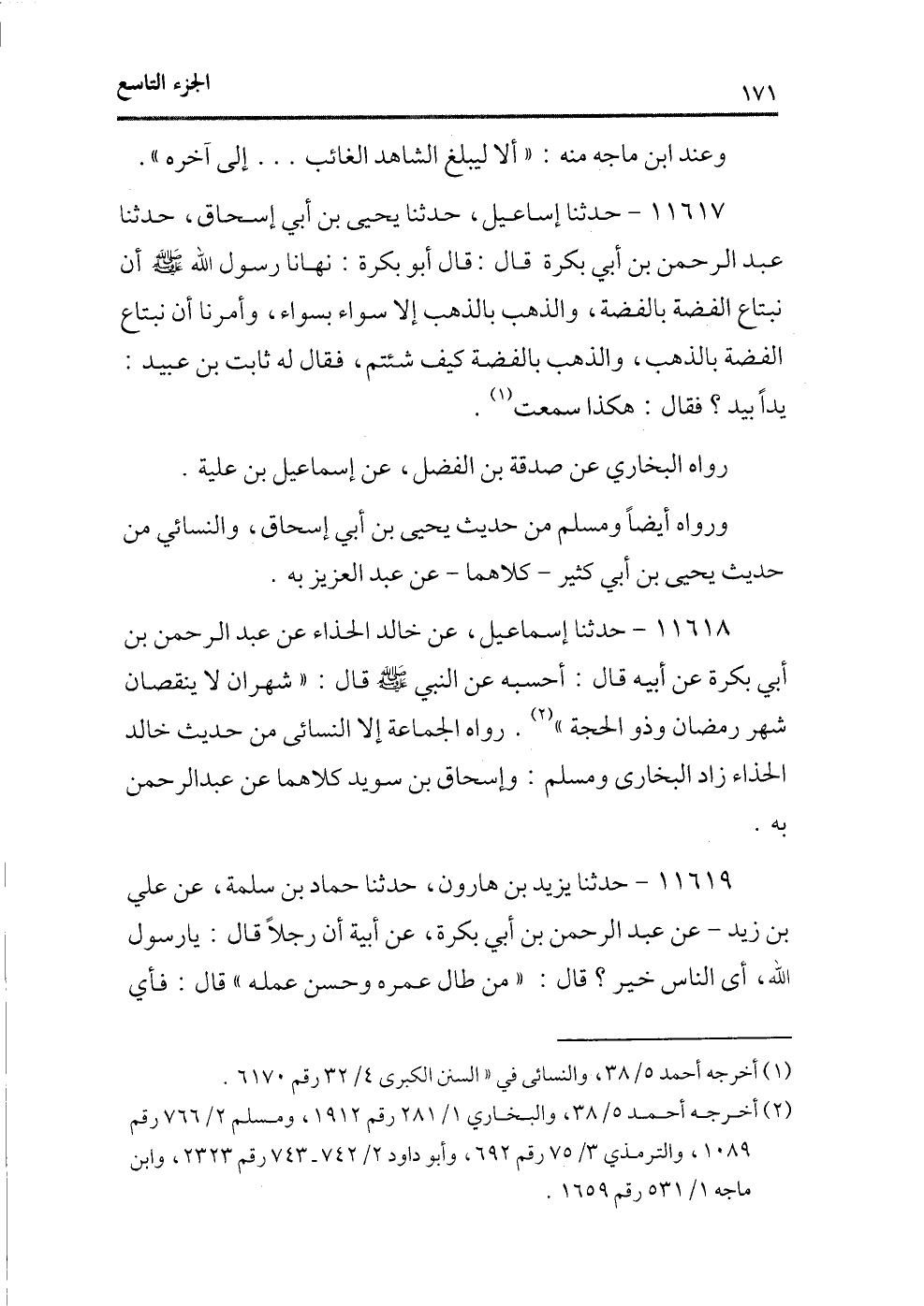 11618 - حدثنا إسماعيل، عن خالد الحذاء عن عبد الرحمن بن أبى بكرة عن أبيه قال: أحسبه عن النبى - صلى الله عليه وسلم - قال: «شهران لا ينقصان شهر رمضان وذو الحجة» (¬2) . رواه الجماعة إلا النسائى من حديث خالد الحذاء زاد البخارى ومسلم: وإسحاق بن سويد كلاهما عن عبد الرحمن به.