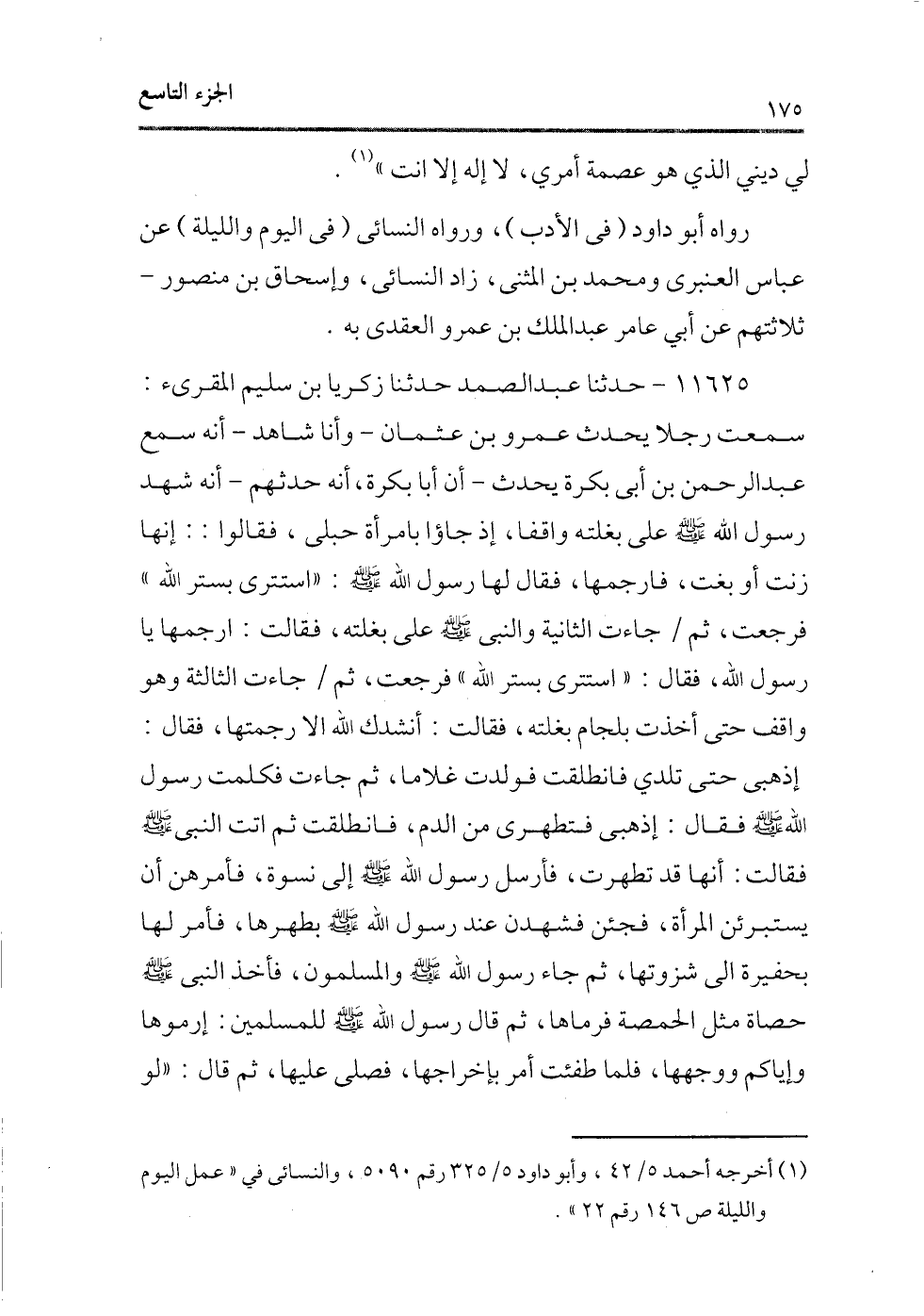 11625 - حدثنا عبد الصمد حدثنا زكريا بن سليم المقرئ: سمعت رجلاً يحدث عمرو بن عثمان ـ وأنا شاهد ـ أنه سمع عبد الرحمن بن أبى بكرة يحدث ـ أن أبا بكرة، أنه حدثهم ـ أنه شهد رسول الله - صلى الله عليه وسلم - على بغلته واقفًا، إذا جاؤا بامرأة حبلى، فقالوا: إنها زنت أو بغت، فارجمها، فقال لها رسول الله - صلى الله عليه وسلم -: «استترى بستر الله» فرجعت، ثم/ جاءت الثانية والنبى - صلى الله عليه وسلم - على بغلته، فقال: ارجمها يا رسول الله، فقال: «استترى بستر الله» فرجعت، ثم/ جاءت الثالثة وهو واقف حتى أخذت بلجام بغلته، فقال: أنشدك الله إلا رجمتها، فقال: إذهبى حتى تلدى فانطلقت فولدت غلامًا، ثم جاءت فكلمت رسول الله - صلى الله عليه وسلم - فقال: إذهبى فتطهرى من الدم، فانطلقت ثم أتت النبى - صلى الله عليه وسلم - فقالت: أنها قد تطهرت، فأرسل رسول الله - صلى الله عليه وسلم - إلى نسوة، فأمرهن أن يستبرئن المرأة، فجئن فشهدن عند رسول الله - صلى الله عليه وسلم - بطهرها، فأمر لها بحفيرة إلى شزوتها، ثم جاء رسول الله - صلى الله عليه وسلم - والمسلمون، فأخذ النبى - صلى الله عليه وسلم - حصاة مثل الحمصة فرماها، ثم قال رسول الله - صلى الله عليه وسلم - للمسلمين: إرموها وإياكم ووجهها، فلما طفئت أمر بإخراجها، فصلى عليها، ثم قال: «لو