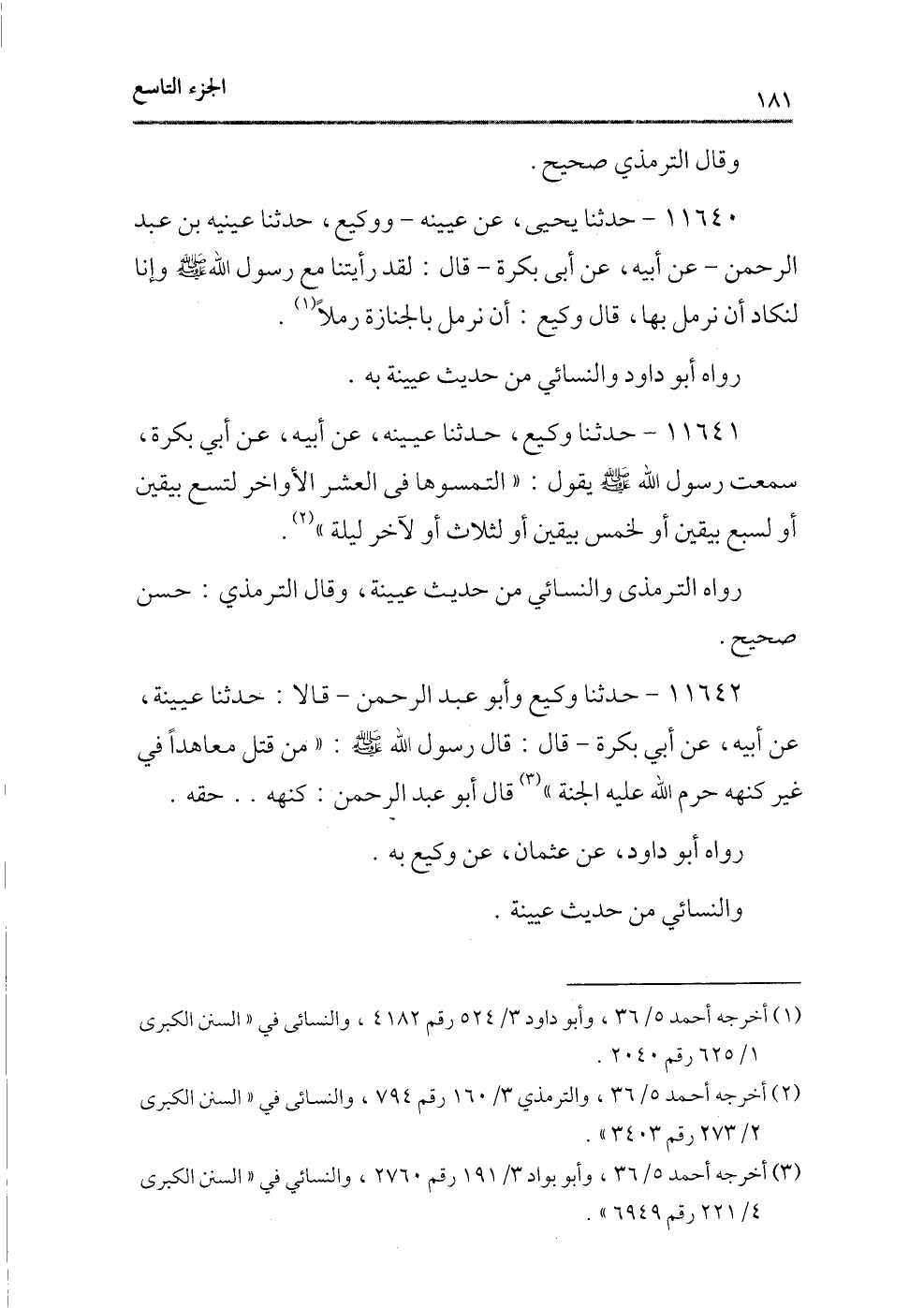 11642 - حدثنا وكيع وأبو عبد الرحمن ـ قالا: حدثنا عيينة، عن أبيه، عن أبى بكرة ـ قال: قال رسول الله - صلى الله عليه وسلم -: «من قتل معاهدًا فى غير كنهه حرم الله عليه الجنة» (¬3) قال أبو عبد الرحمن: كنهه.. حقه.