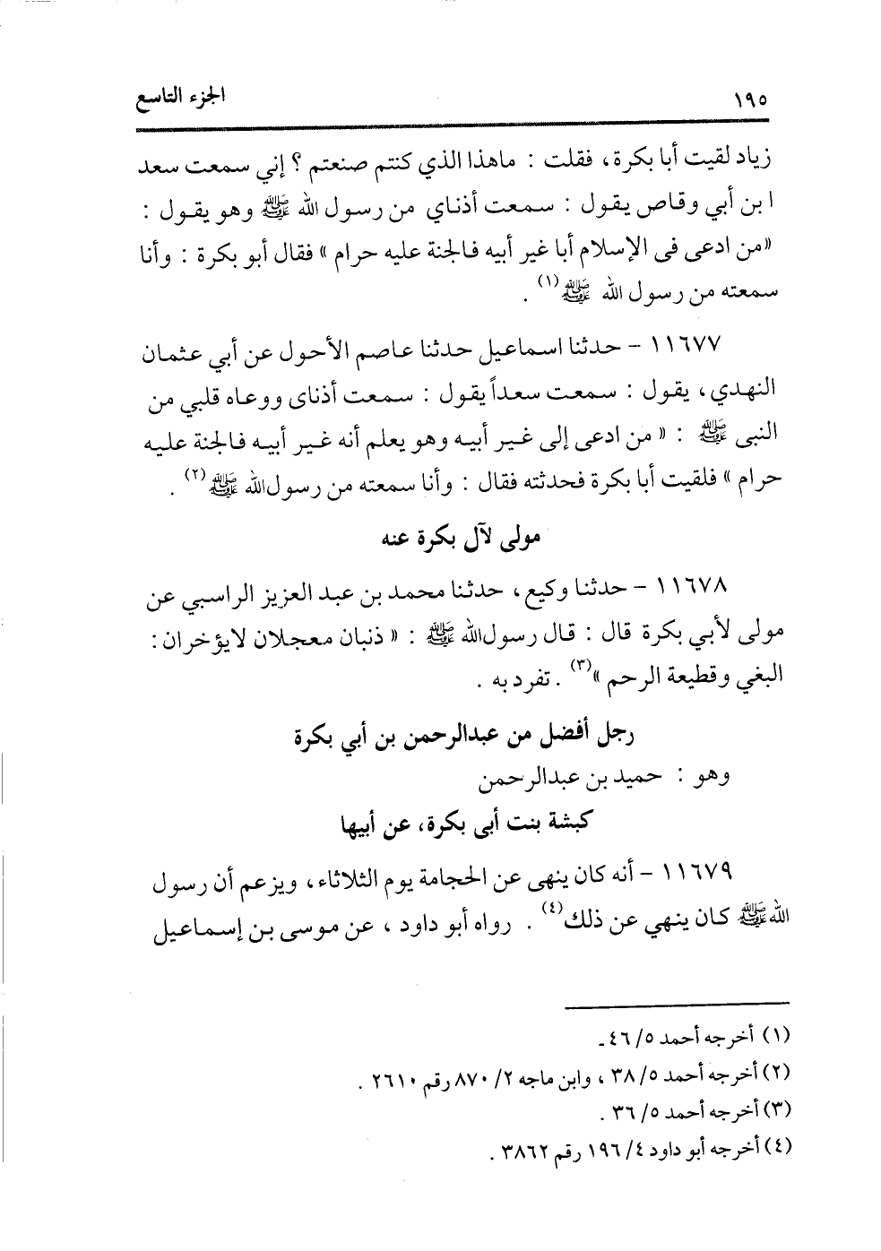 11678 - حدثنا وكيع، حدثنا محمد بن عبد العزيز الراسبى عن مولى لأبى بكرة قال: قال رسول الله - صلى الله عليه وسلم -: «ذنبان معجلان لا يؤخران: البغى وقطيعة الرحم» (¬2) . تفرد به.