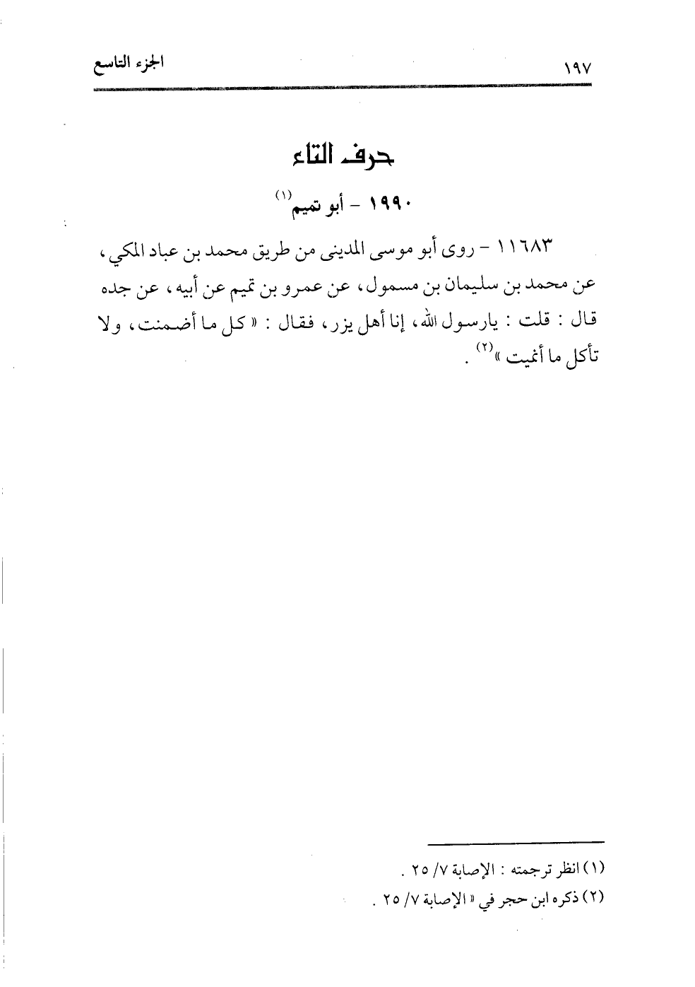 11683 - روى أبو موسى المدينى من طريق محمد بن عباد المكى، عن محمد ابن سليمان بن مسمول، عن عمرو بن تميم عن أبيه، عن جده قال: قلت: يا رسول الله، إنا أهل يزر، فقال: «كل ما أضمنت، ولا تأكل ما أنميت» (¬2) .