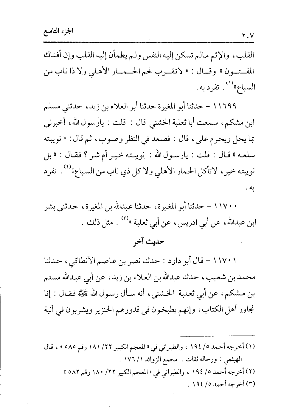 11699 - حدثنا أبو المغيرة حدثنا أبو العلاء بن زيد، حدثنى مسلم بن مشكم، سمعت أبا ثعلبة الخشنى قال: قلت: يا رسول الله، أخبرنى بما يحل ويحرم على، قال: فصعد فى النظر وصوب، ثم قال: «نويبته سلعه» قال: قلت: يا رسول الله: نويبته خير أم شر؟ فقال: «بل نويبته خير، لا تأكل الحمار الأهلى ولا كل ذى ناب من السباع» (¬1) . تفرد به.