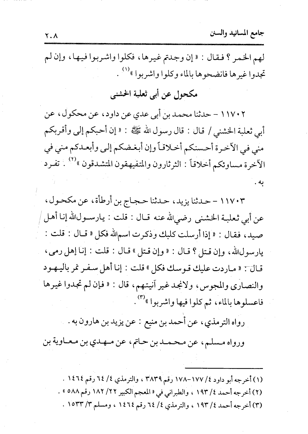 11703 - حدثنا يزيد، حدثنا حجاج بن أرطأة، عن مكحول، عن أبى ثعلبة الخشنى - رضي الله عنه - قال: قلت: يا رسول الله إنا أهل صيد، فقال: «إذا أرسلت كلبك وذكرت أسم الله فكل» قال: قلت: يا رسول الله، وإن قتل؟ قال: «وإن قتل» قال: قلت: إنا إهل رمى، قال: «ما ردت عليك قوسك فكل» قلت: إنا أهل سفر نمر باليهود والنصارى والمجوس، ولا نجد غير آنيتهم، قال: «فإن لم تجدوا غيرها فاغسلوها بالماء، ثم كلوا فيها واشربوا» (¬2) .