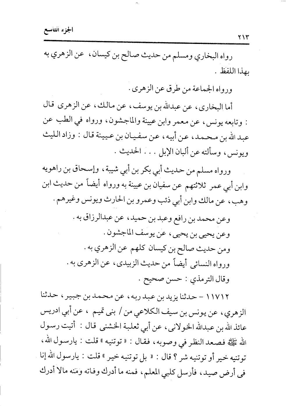 11712 - حدثنا يزيد بن عبد ربه، عن محمد بن جبير، حدثنا الزهرى، عن يونس بن سيف الكلاعى من/ بنى تميم، عن أبى إدريس عائذ الله بن عبد الله الخولانى، عن أبى ثعلبة الخشنى قال: أتيت رسول الله - صلى الله عليه وسلم - فصعد النظر فى وصوبه، فقال: «توتنيه» قلت: يا رسول الله، توتنيه خير أو توتنيه شر؟ قال: «بل توتنيه خير» قلت: يا رسول الله إنا فى أرض صيد، فأرسل كلبى المعلم، فمنه ما أدرك وفاته ومنه مالا