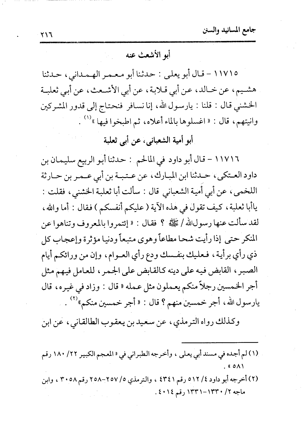 11715 - قال أبو يعلى: حدثنا أبو معمر الهمدانى، حدثنا هشيم، عن خالد، عن أبى قلابة، عن أبى الأشعث، عن أبى ثعلبة الخشنى قال: قلنا: يا رسول الله، إنا نسافر فنحتاج إلى قدور المشركين وآنيتهم، قال: «أغسلوها بالماء أعلاه، ثم أطبخوا فيها» (¬1) .