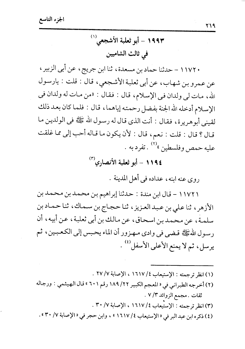 11720 - حدثنا حماد بن مسعدة، ثنا ابن جريج، عن أبى الزبير، عن عمرو ابن شهاب، عن أبى ثعلبة الأشجعى، قال: قلت: يا رسول الله، مات لى ولدان فى الإسلام، قال: فقال: «من مات له ولدان فى الإسلام أدخله الله الجنة بفضل رحمته إياهما» ، قال: فلما كان بعد ذلك لقينى أبو هريرة، فقال: أنت الذى قال له رسول الله - صلى الله عليه وسلم - فى الولدين ما قال؟ قال: قلت: نعم، قال: «لأن يكون ما قاله أحب إلى مما غلقت عليه حمص وفلسطين» (¬2) . تفرد به.