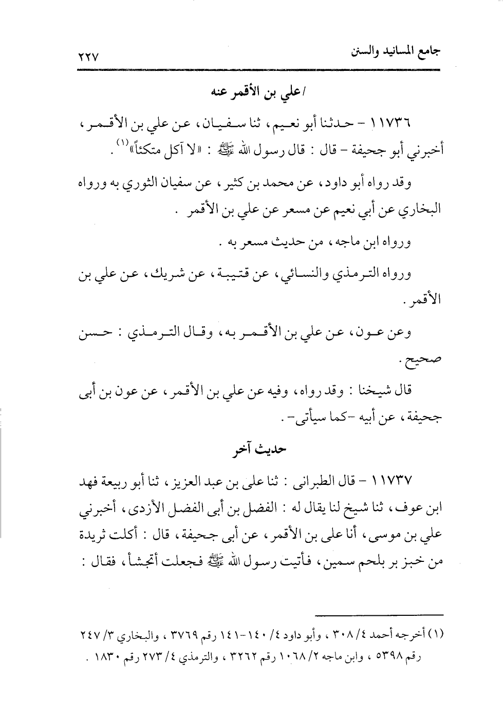 11736 - حدثنا أبو نعيم، ثنا سفيان، عن علي بن الأقمر، أخبرنى أبو جحيفة ـ قال: قال رسول الله - صلى الله عليه وسلم -: «لا آكل متكئًا» (¬1) .