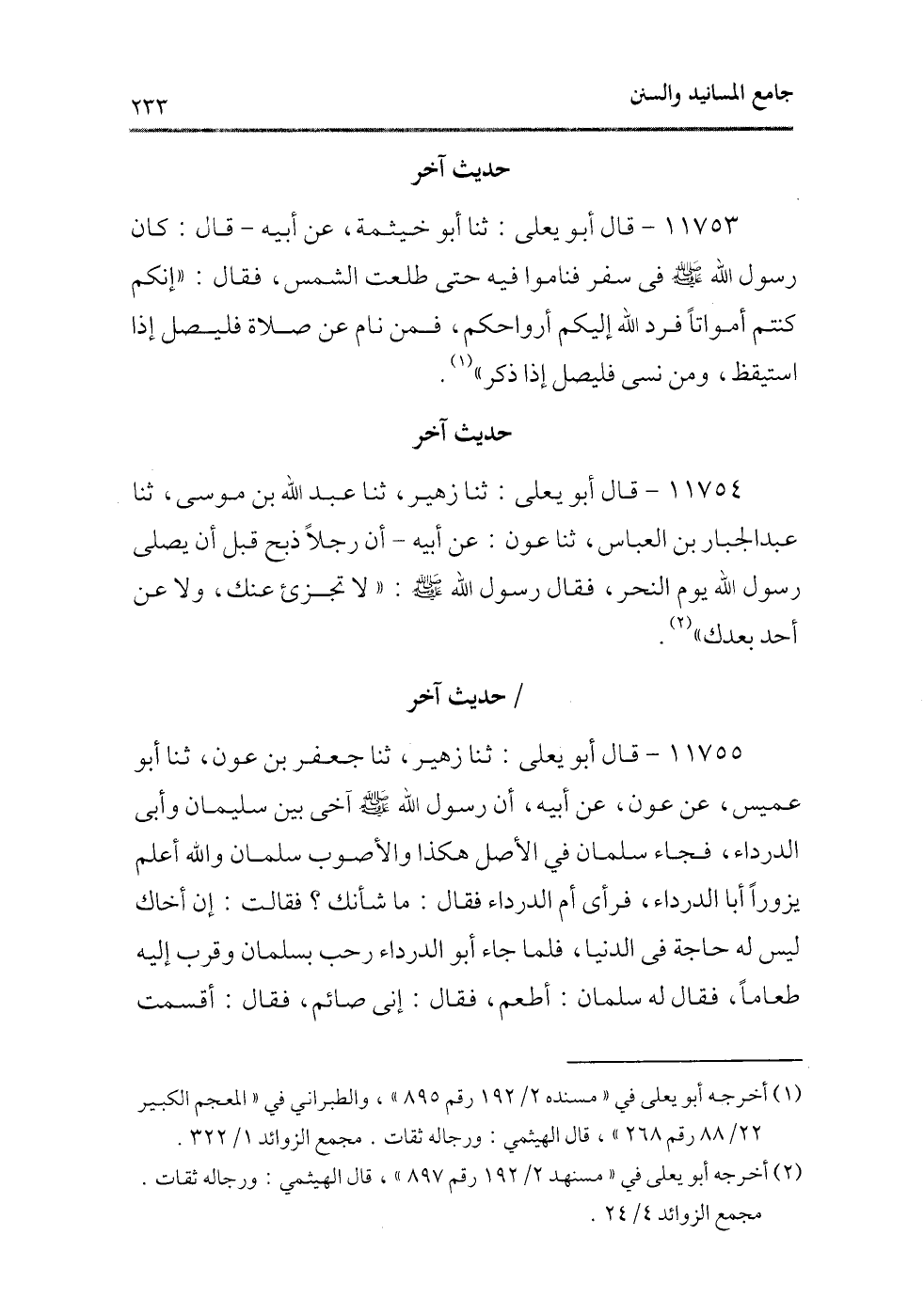 11755 - قال أبو يعلى: ثنا زهير، ثنا جعفر بن عون، ثنا أبو عميس، عن عون، عن أبيه، أن رسول الله - صلى الله عليه وسلم - آخى بين سليمان وأبى الدرداء، فجاء سلمان في الأصل هكذا والأصوب سلمان والله أعلم يزورًا أبا الدرداء، فرأى أم الدرداء فقال: ما شأنك؟ فقالت: إن أخاك ليس له حاجة فى الدنيا، فلما جاء أبو الدرداء رحب بسلمان وقرب إليه طعامًا، فقال له سلمان: أطعم، فقال: إنى صائم، فقال: أقسمت