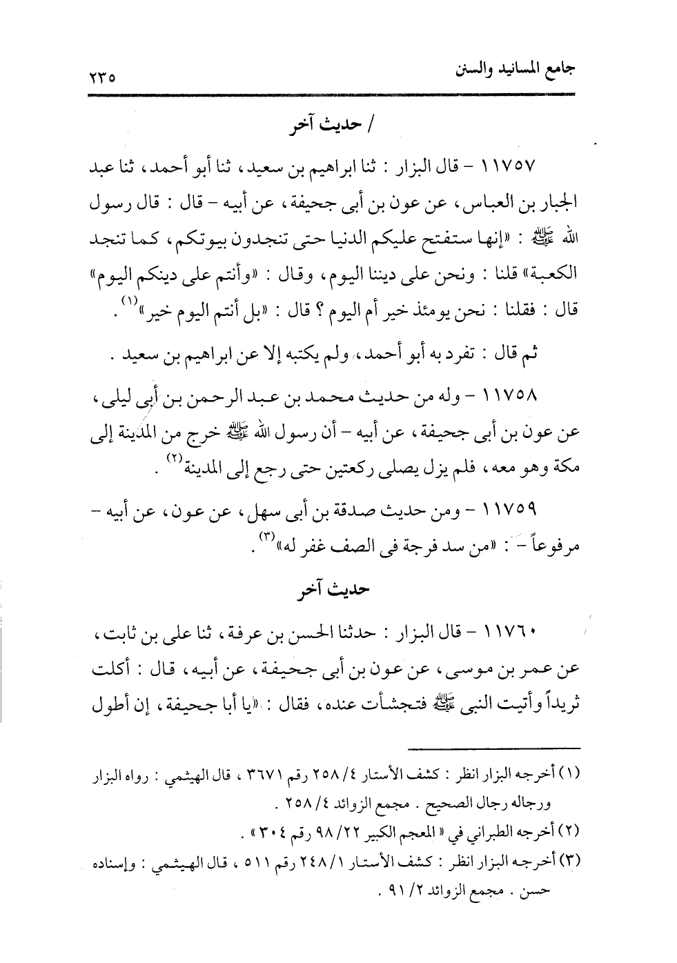 11757 - قال البزار: ثنا إبراهيم بن سعيد، ثنا أبو أحمد، ثنا عبد الجبار بن العباس، عن عون بن أبى جحيفة، عن أبيه ـ قال: قال رسول الله - صلى الله عليه وسلم -: «إنها ستفتح عليكم الدنيا حتى تنجدون بيوتكم، كما تنجد الكعبة» قلنا: ونحن على ديننا اليوم، وقال: «وأنتم على دينكم اليوم» قال: فقلنا: نحن يومئذ خير أم اليوم؟ قال: «بل أنتم اليوم خير» (¬1) .