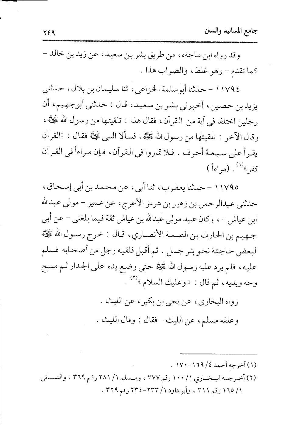 11794 - حدثنا أبو سلمة الخزاعى، ثنا سليمان بن بلال، حدثنى يزيد بن حصين، أخبرنى بشر بن سعيد، قال: حدثنى أبو جهيم، أن رجلين أختلف فى آية من القرآن، فقال هذا: تلقيتها من رسول الله - صلى الله عليه وسلم -، وقال الآخر: تلقيتها من رسول الله - صلى الله عليه وسلم -، فسألا النبى - صلى الله عليه وسلم - فقال: «القرآن يقرأ على سبعة أحرف. فلا تماروا فى القرآن، فإن مراءًا فى القرآن كفر» (¬1) . (مراءًا)