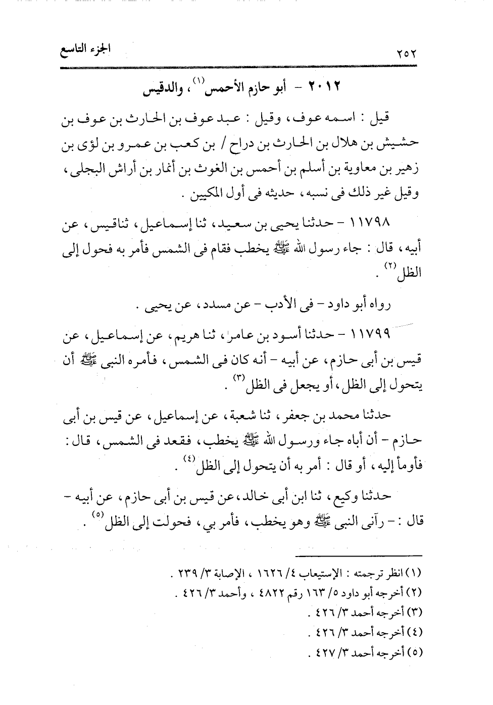 حدثنا وكيع، ثنا ابن أبى خالد، عن قيس بن أبى حازم، عن أبيه ـ قال: ـ رآنى النبى - صلى الله عليه وسلم - وهو يخطب، فأمر بى، فحولت إلى الظل (¬5) .