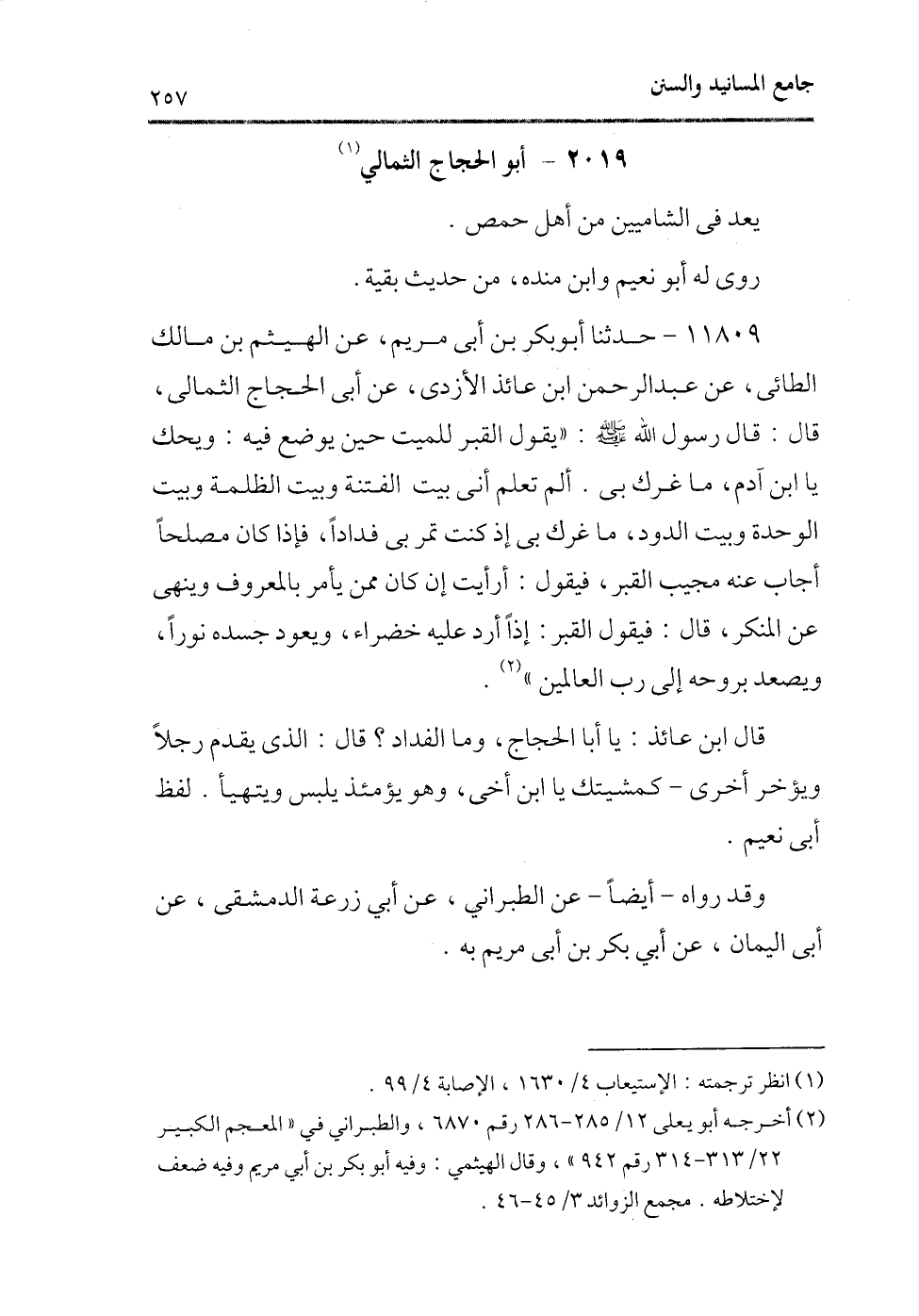 11809 - حدثنا أبو بكر بن أبى مريم، عن الهيثم بن مالك الطائى، عن عبد الرحمن ابن عائذ الأزدى، عن أبى الحجاج الثمالى، قال: قال رسول الله - صلى الله عليه وسلم -: «يقول القبر للميت حين يوضع فيه: ويحك يا ابن آدم، ما غرك بى. ألم تعلم أنى بيت الفتنة وبيت الظلمة وبيت الوحدة وبيت الدود، ما غرك بى إذ كنت تمر بى فدادًا، فإذا كان مصلحًا أجاب عنه مجيب القبر، فيقول: أرأيت إن كان ممن يأمر بالمعروف وينهى عن المنكر، قال: فيقول القبر: إذًا أرد عليه خضراءٍ، ويعود جسده نورًا، ويصعد بروحه إلى رب العالمين» (¬2) .