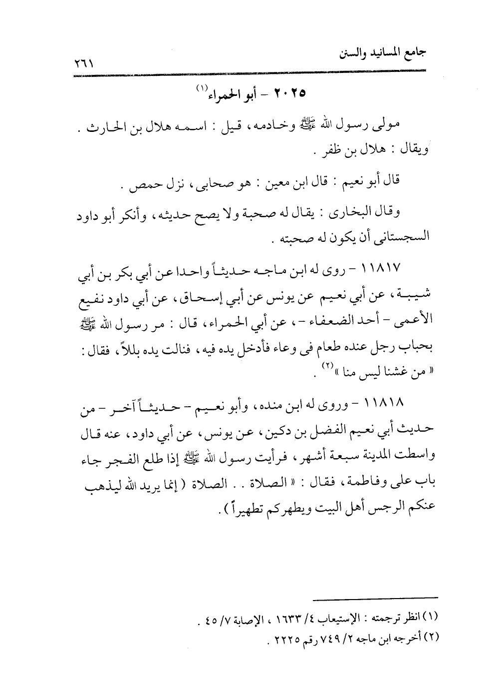 11817 - روى له ابن ماجه حديثًا واحدًا عن أبى بكر بن أبى شيبة، عن أبى نعيم عن يونس عن أبى إسحاق، عن أبى داود نفيع الأعمى ـ أحد الضعفاء ـ، عن أبى الحمراء، قال: مر رسول الله - صلى الله عليه وسلم - بحباب رجل عنده طعام فى وعاء فأدخل يده فيه، فنالت يده بللاً، فقال: «من غشنا ليس منا» (¬2) .