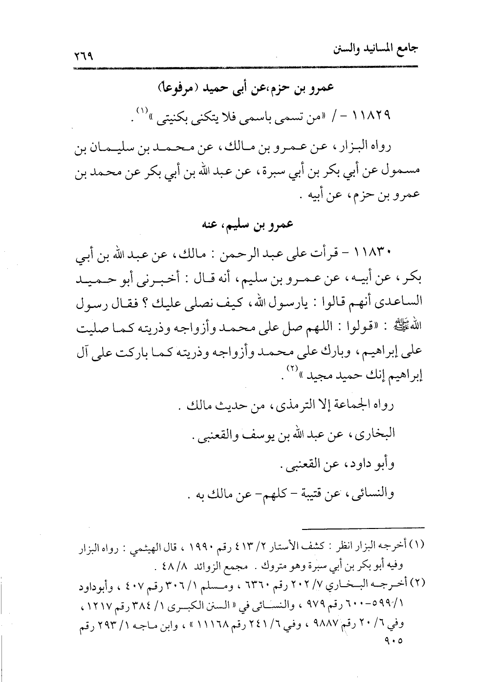 11830 - قرأت على عبد الرحمن: مالك، عن عبد الله بن أبى بكر، عن أبيه، عن عمرو بن سليم، أنه قال: أخبرنى أبو حميد الساعدى أنهم قالوا: يا رسول الله، كيف نصلى عليك؟ فقال رسول الله - صلى الله عليه وسلم -: «قولوا: اللهم صل على محمد وأزواجه وذريته كما صليت على إبراهيم، وبارك على محمد وأزواجه وذريته كما باركت على آل إبراهيم إنك حميد مجيد» (¬2) .