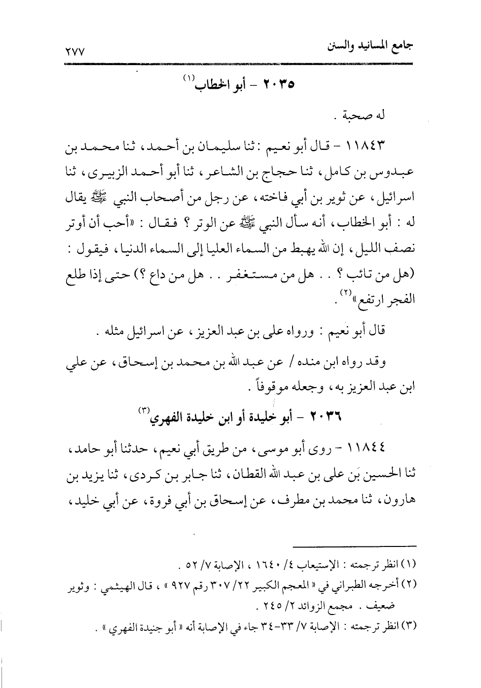 11843 - قال أبو نعيم: ثنا سليمان بن أحمد، ثنا محمد بن عبدوس بن كامل، ثنا حجاج بن الشاعر، ثنا أبو أحمد الزبيرى، ثنا إسرائيل، عن ثوير بن أبى فاخته، عن رجل من أصحاب النبى - صلى الله عليه وسلم - يقال له: أبو الخطاب، أنه سأل النبى - صلى الله عليه وسلم - عن الوتر؟ فقال: «أحب أن أوتر نصف الليل، إن الله يهبط من السماء العليا إلى السماء الدنيا، فيقول: (هل من تائب؟.. هل من مستغفر.. هل من داع؟) حتى إذا طلع الفجر ارتفع» (¬2) .