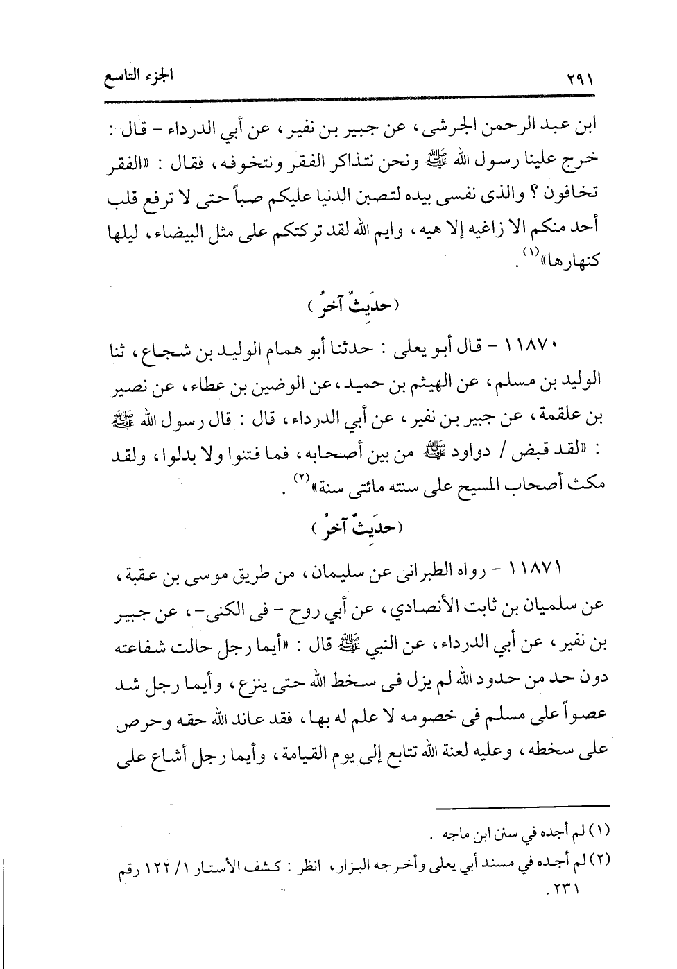 11870 - قال أبو يعلى: حدثنا أبو همام الوليد بن شجاع، ثنا الوليد بن مسلم، عن الهيثم بن حميد، عن الوضين بن عطاء، عن نصير بن علقمة، عن جبير ابن نفير، عن أبى الدرداء، قال: قال رسول الله - صلى الله عليه وسلم -: «لقد قبض/ داود - صلى الله عليه وسلم - من بين أصحابه، فما فتنوا ولا بدلوا، ولقد مكث أصحاب المسيح على سنته مائتى سنة» (¬1) .