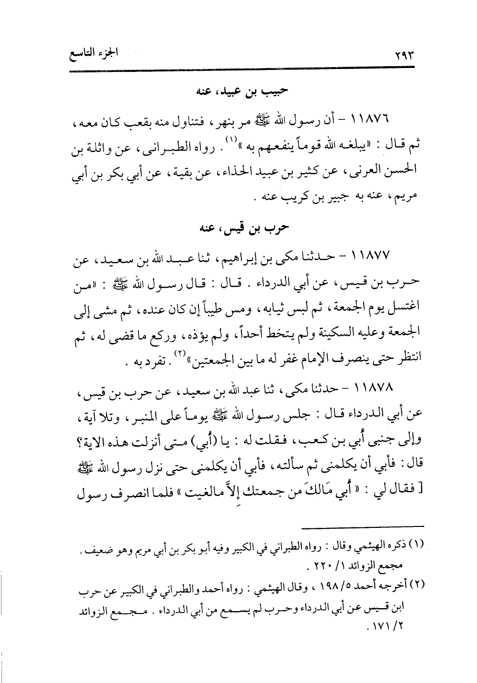 (¬2) أخرجه أحمد 5/198، وقال الهيثمى: رواه أحمد والطبرانى فى الكبير عن حرب ابن قيس عن أبى الدرداء وحرب لم يسمع من أبى الدرداء. مجمع الزوائد: 2/171.