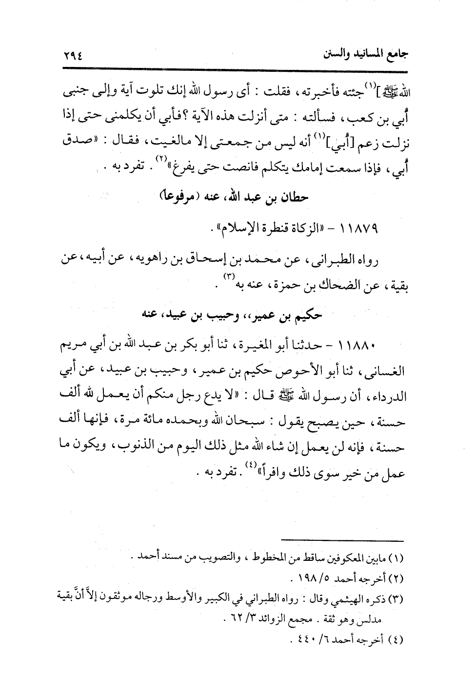 11880 - حدثنا أبو المغيرة، ثنا أبو بكر بن عبد الله بن أبى مريم الغسانى، ثنا أبو الأحوص حكيم بن عمير، وحبيب بن عبيد، عن أبى الدرداء، أن رسول الله - صلى الله عليه وسلم - قال: «لا يدع رجل منكم أن يعمل لله ألف حسنة، حين يصبح يقول: