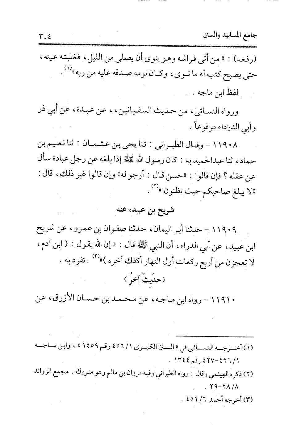 11909 - حدثنا أبو اليمان، حدثنا صفوان بن عمرو، عن شريح بن عبيد، عن أبى الدرداء، أن النبى - صلى الله عليه وسلم - قال: «إن الله يقول: (ابن آدم، لا تعجزن من أربع ركعات أول النهار أكفك آخره) » (¬2) . تفرد به.