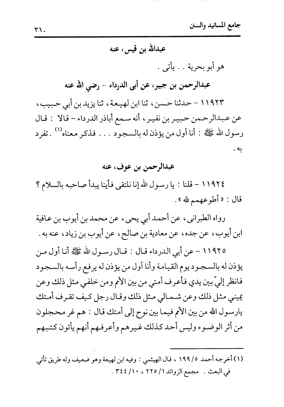 11925 - عن أبى الدرداء قال: قال رسول الله - صلى الله عليه وسلم - أنا أول من يؤذن له بالسجود يوم القيامة وأنا أول من يؤذن له يرفع رأسه بالسجود فانظر إليّ بين يدى فأعرف أمتى من بين الأمم ومن خلفى مثل ذلك وعن يمينى مثل ذلك وعن شمالى مثل ذلك وقال رجل كيف تعرف أمتك يا رسول الله من بين الأمم فيما بين نوح إلى أمتك قال: هم غر محجلون من أثر الوضوء وليس أحد كذلك غيرهم وأعرفهم أنهم يأتون كتبهم