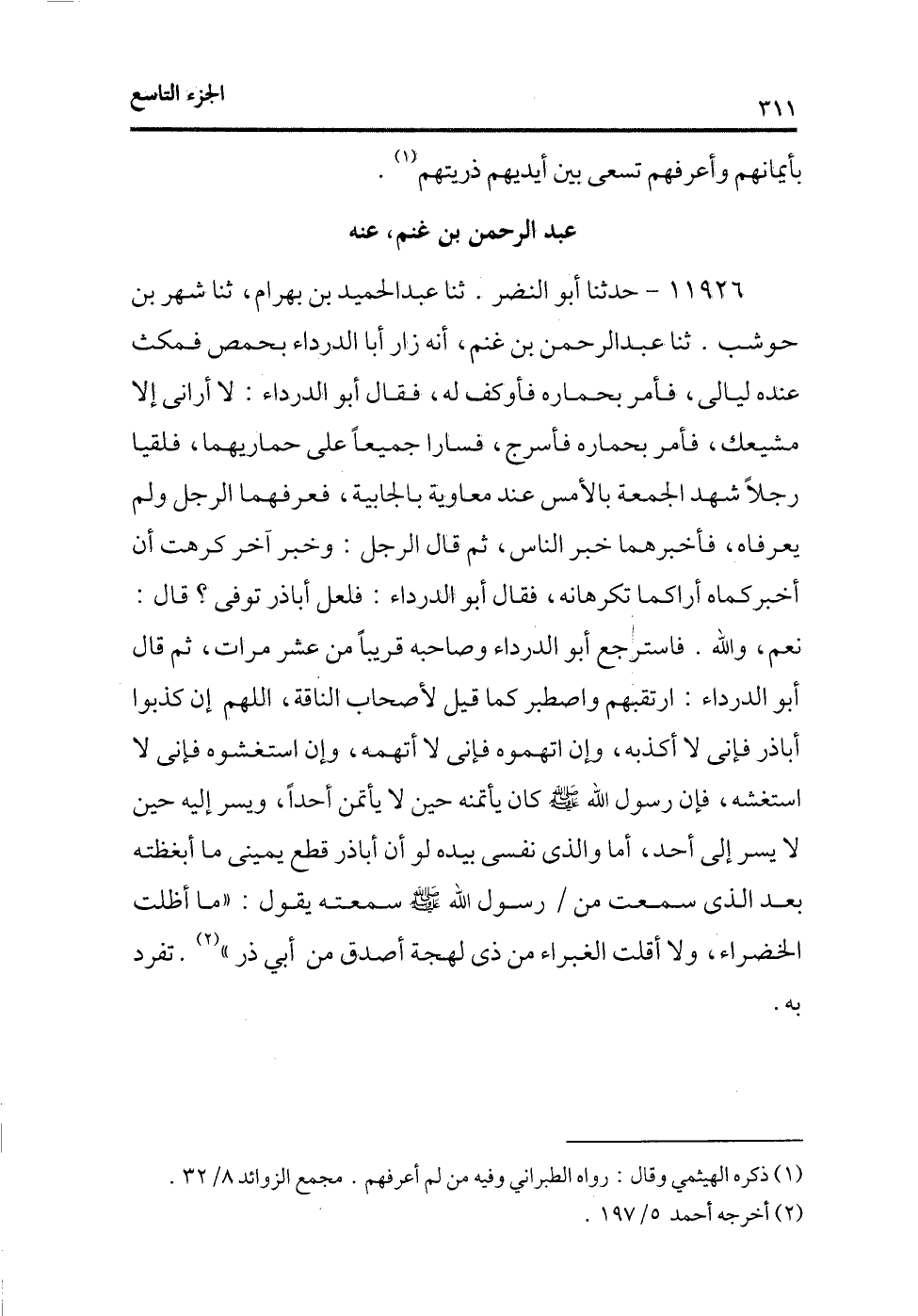 11926 - حدثنا أبو النضر. ثنا عبد الحميد بن بهرام، ثنا شهر بن حوشب، ثنا عبد الرحمن بن غنم، أنه زار أبا الدرداء بحمص فمكث عنده ليالى، فأمر بحماره فأوكف له، فقال أبو الدرداء، لا آرانى إلا مشيعك، فأمبر بحماره فأسرج، فسارا جميعًا على حماريهما، فلقيا رجلاً شهد الجمعة بالأمس عند معاوية بالجابية، فعرفهما الرجل ولم يعرفاه، فأخبرهما خبر الناس، ثم قال الرجل: وخبر آخر كرهت أن أخبركماه أراكما تكرهانه، فقال أبو الدرداء: فلعل أبا ذر توفى، قال: نعم،
