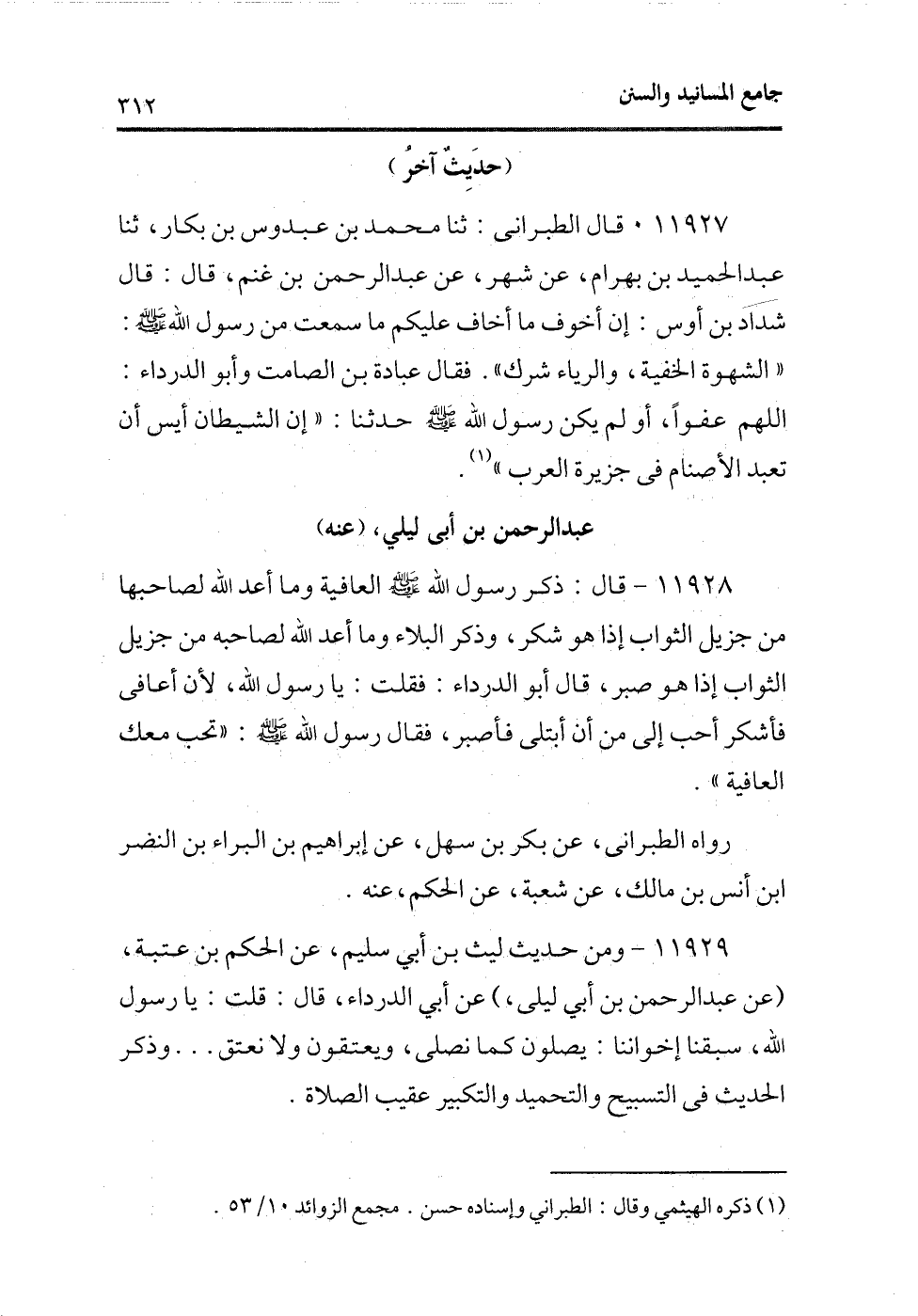 11927 - قال الطبرانى: ثنا محمد بن عبدوس بن بكار، ثنا عبد الحميد بن بهرامن عن شهر، عن عبد الرحمن بن غنم، قال: قال شداد بن أوس: إن أخوف ما أخاف عليكم ما سمعت من رسول الله - صلى الله عليه وسلم -: «الشهوة الخفية، والرياء شرك» . فقال عبادة بن الصامت وأبو الدرداء: اللهم عفوًا، أو لم يكن رسول الله - صلى الله عليه وسلم - حدثنا: «إن الشيطان أيس أن تعبد الأصنام فى جزيرة العرب» (¬1) .