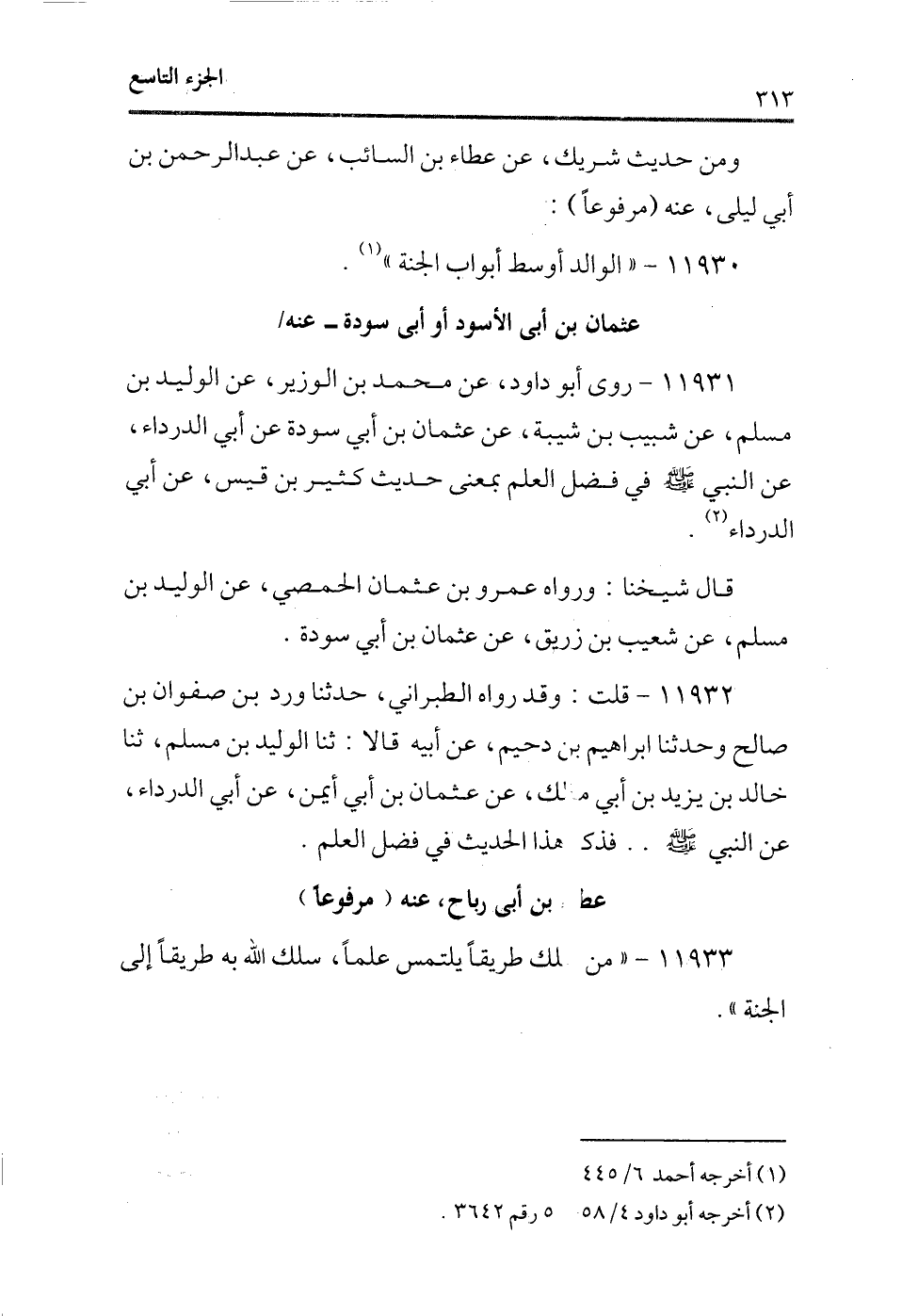 11931 - روى أبو داود، عن محمد بن الوزير، عن الوليد بن مسلم، عن شبيب بن شيبة، عن عثمان بن أبى سودة عن أبى الدرداء، عن النبى - صلى الله عليه وسلم - فى فضل العلم بمعنى حديث كثير بن قيس، عن أبى الدرداء (¬2) .