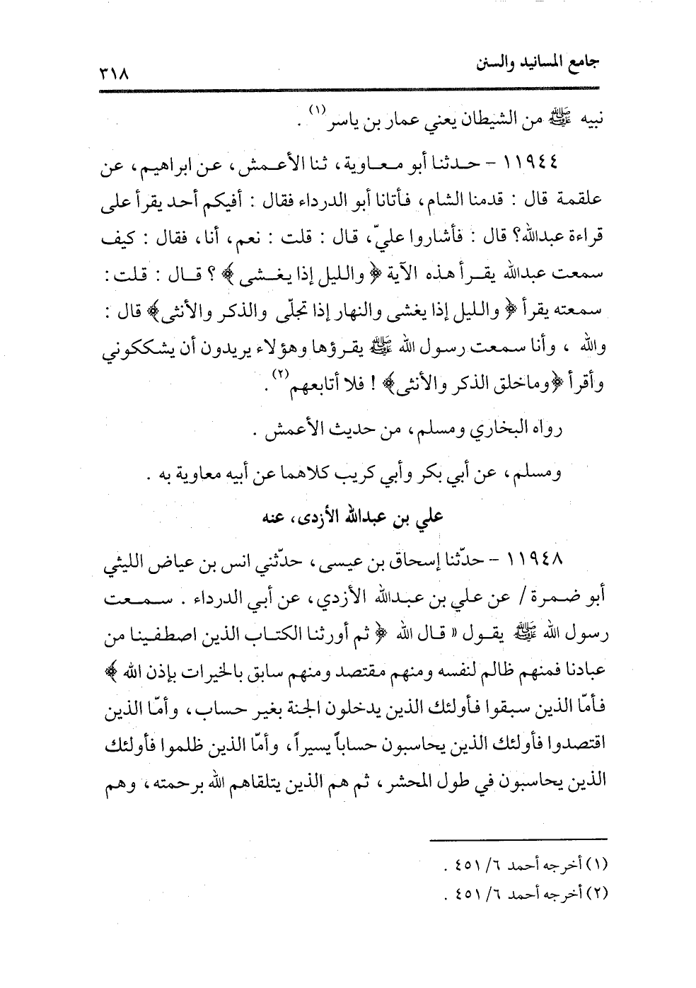 11944 - حدثنا أبو معاوية، ثنا الأعمش، عن إبراهيم، عن علقمة قال: قدمنا الشام، فأتانا أبو الدرداء فقال: أفيكم أحد يقرأ على قراؤة عبد الله؟ قال: فأشاروا عليّ، قال: قلت: نعم، أنا، فقال: كيف سمعت عبد الله يقرأ هذه الآية {وَاللَّيْلِ إِذَا يَغْشَى} ؟ قال: قلت: سمعته يقرأ {وَاللَّيْلِ إِذَا يَغْشَى وَالنَّهَارِ إِذَا تَجَلَّى وَالذَّكَرَ وَالْأُنْثَى} قال: والله، وأنا سمعت رسول الله - صلى الله عليه وسلم - يقرؤها وهؤلاء يريدون أن يشككونى وأقرأ {وَمَا خَلَقَ الذَّكَرَ وَالْأُنْثَى} ! فلا أتابعهم (¬1) .