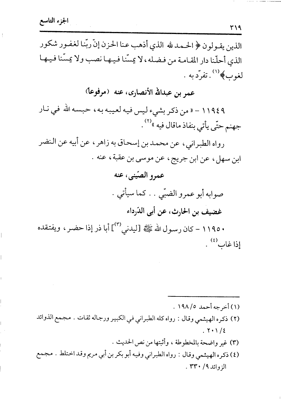 11949 - «من ذكر بشىء ليس فيه لعيبه به، حبسه الله فى نار جهنم حتى يأتى بنفاذ ما قال فيه» (¬1) .