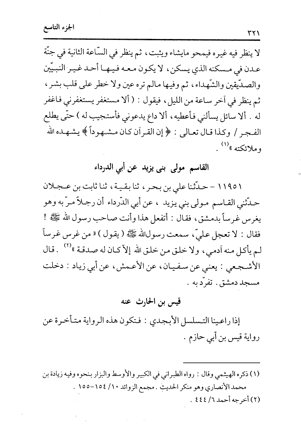 11954 - حدثنا علي بن بحر، ثنا بقية، ثنا ثابت بن عجلان حدثنى القاسم مولى بنى يزيد، عن أبى الدرداء أن رجلاً مر به وهو يغرس غرسًا بدمشق، فقال: أتفعل هذا وأنت صاحب رسول الله - صلى الله عليه وسلم -! فقال: لا تعجل عليّ، سمعت رسول الله - صلى الله عليه وسلم - (يقول) «من غرس غرسًا لم يأكل منه آدمي، ولا خلق من خلق الله إلاّ كان له صدقة» (¬1) . قال الأشجعى: يعنى عن سفيان، عن الأعمش، عن أبى زياد: دخلت مسجد دمشق. تفرد به.