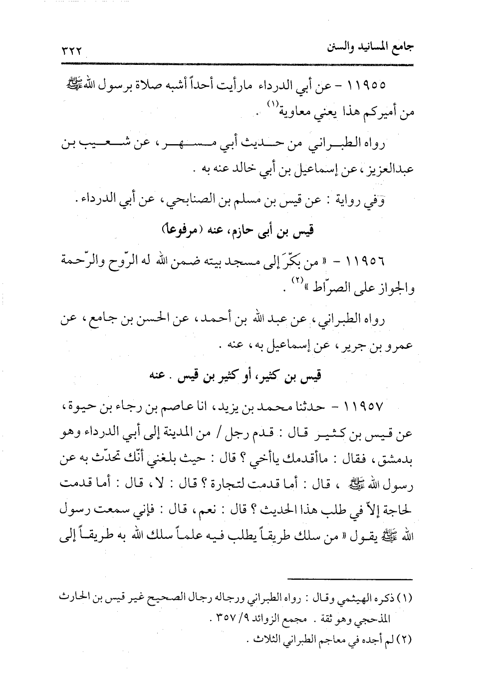 11957 - حدثنا محمد بن يزيد، أن عاصم بن رجاء بن حيوة، عن قيس بن كثير قال: قدم رجل/ من المدينة إلى أبى الدرداء وهو بدمشق، فقال: ما أقدمك يا أخى؟ قال: حيث بلغنى أنك تحدث به عن رسول الله - صلى الله عليه وسلم -، قال: أما قدمت لتجارة؟ قال: لا، قال: أما قدمت لحاجة إلا فى طلب هذا الحديث؟ قال: نعم، قال: فإنى سمعت رسول الله - صلى الله عليه وسلم - يقول «من سلك طريقًا يطلب فيه علمًا سلك الله به طريقًا إلى