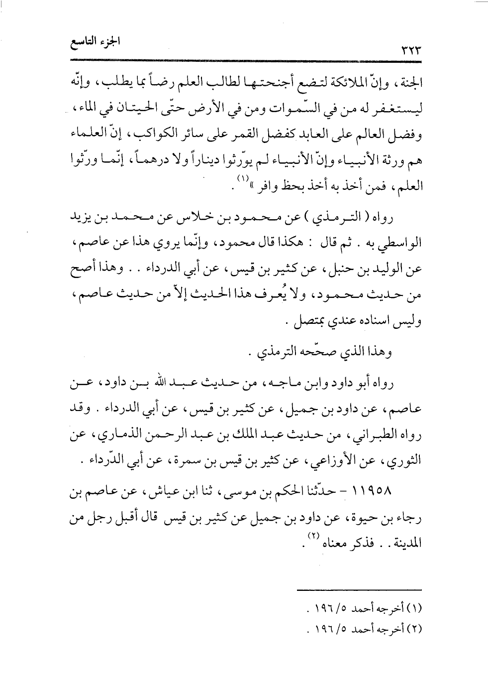 رواه (الترمذى) عن محمود بن خلاس عن محمد بن يزيد الواسطى به. ثم قال: هكذا قال محمود، وإنما يروى هذا عن عاصم، عن الوليد بن حنبل، عن كثير بن قيس، عن أبى الدرداء.. وهذا أصح من حديث محمود، ولا يعرف هذا الحديث إلا من حديث عاصم، وليس إسناده عندى بمتصل.