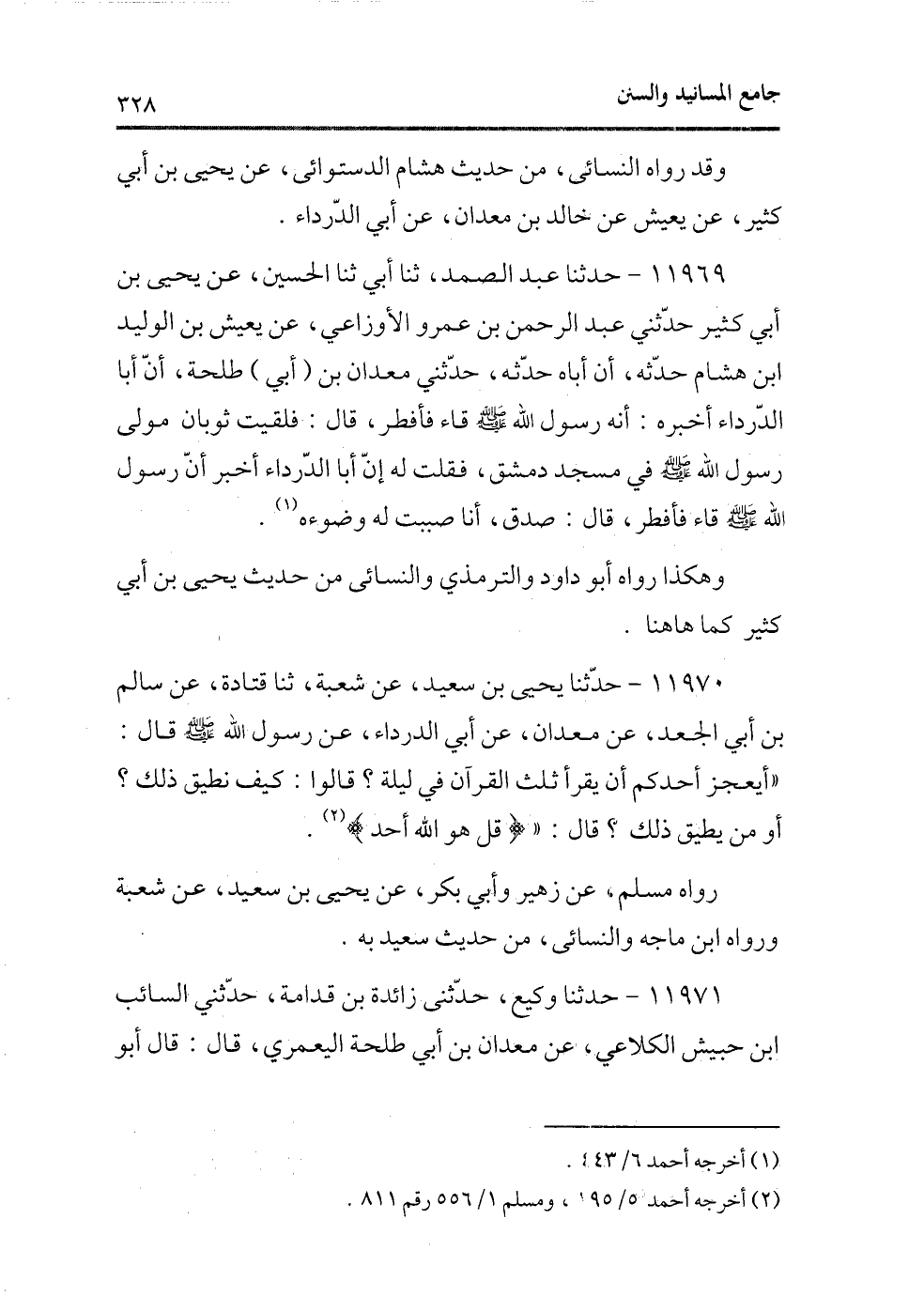 وقد رواه النسائى، من حديث هشام الدستوائى، عن يحيى بن أبى كثير، عن يعيش عن خالد بن معدان، عن أبى الدرداء.