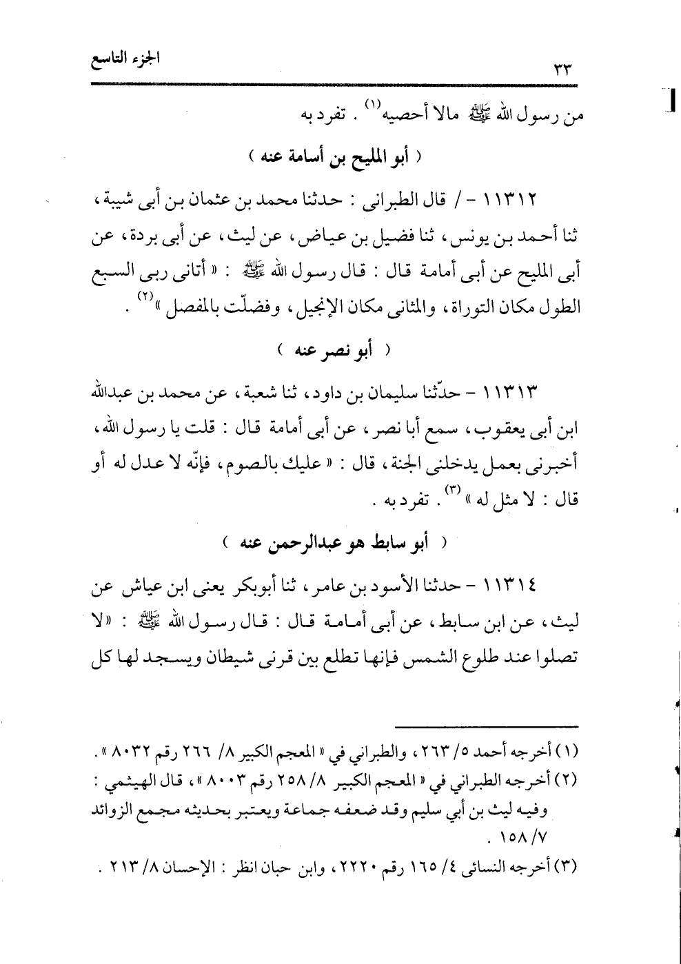 11313 - حدثنا سليمان بن داود، ثنا شعبة، عن محمد بن عبد الله بن أبى يعقوب، سمع أبا نصر، عن أبى أمامة قال: قلت يا رسول الله، أخبرنى بعمل يدخلنى الجنة، قال: «عليك بالصوم، فإنّه لا عدل له أو قال: لا مثل له» (¬2) . تفرد به.
