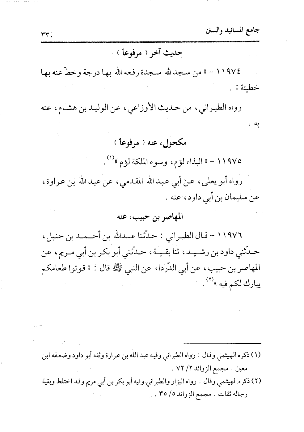 11976 - قال الطبرانى: حدثنا عبد الله بن أحمد بن حنبل، حدثنى داود ابن رشيد، ثنا بقية، حدثنى أبو بكر بن أبى مريم، عن المهاصر بن حبيب، عن أبى الدرداء عن النبى - صلى الله عليه وسلم - قال: «قوتوا طعامكم يباركم لكم فيه» (¬2) .