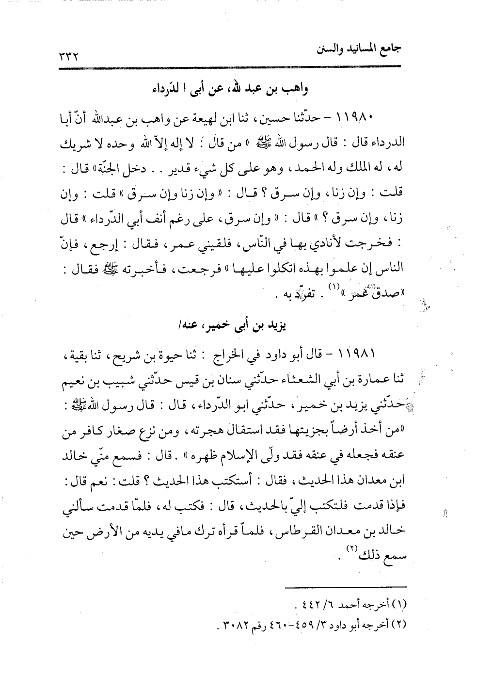 11981 - قال أبو داود فى الخراج: ثنا حيوة بن شريح، ثنا بقية، ثنا عمراة بن أبى الشعثاء حدثنى سنان بن قيس حدثنى شبيب بن نعيم حدثنى يزيد بن خمير، حدثنى أبو الدرداء، قال: قال رسول الله - صلى الله عليه وسلم -: «من أخذ أرضًا بجزيتها فقد استقال هجرته، ومن نزع صغار كافر من عنقه فجعله فى عنقه فقد ولى الإسلام ظهره» . قال: فسمع منى خالد بن معدان هذا الحديث، فقال: أستكتب هذا الحديث؟ قلت: نعم قال: فإذا قدمت فلتكتب إليّ بالحديث، قال: فكتب له، فلما قدمت سألنى خالد بن معدان القرطاس، فلما قرأه ترك ما فى يديه من الأرض حين سمع ذلك (¬2) .