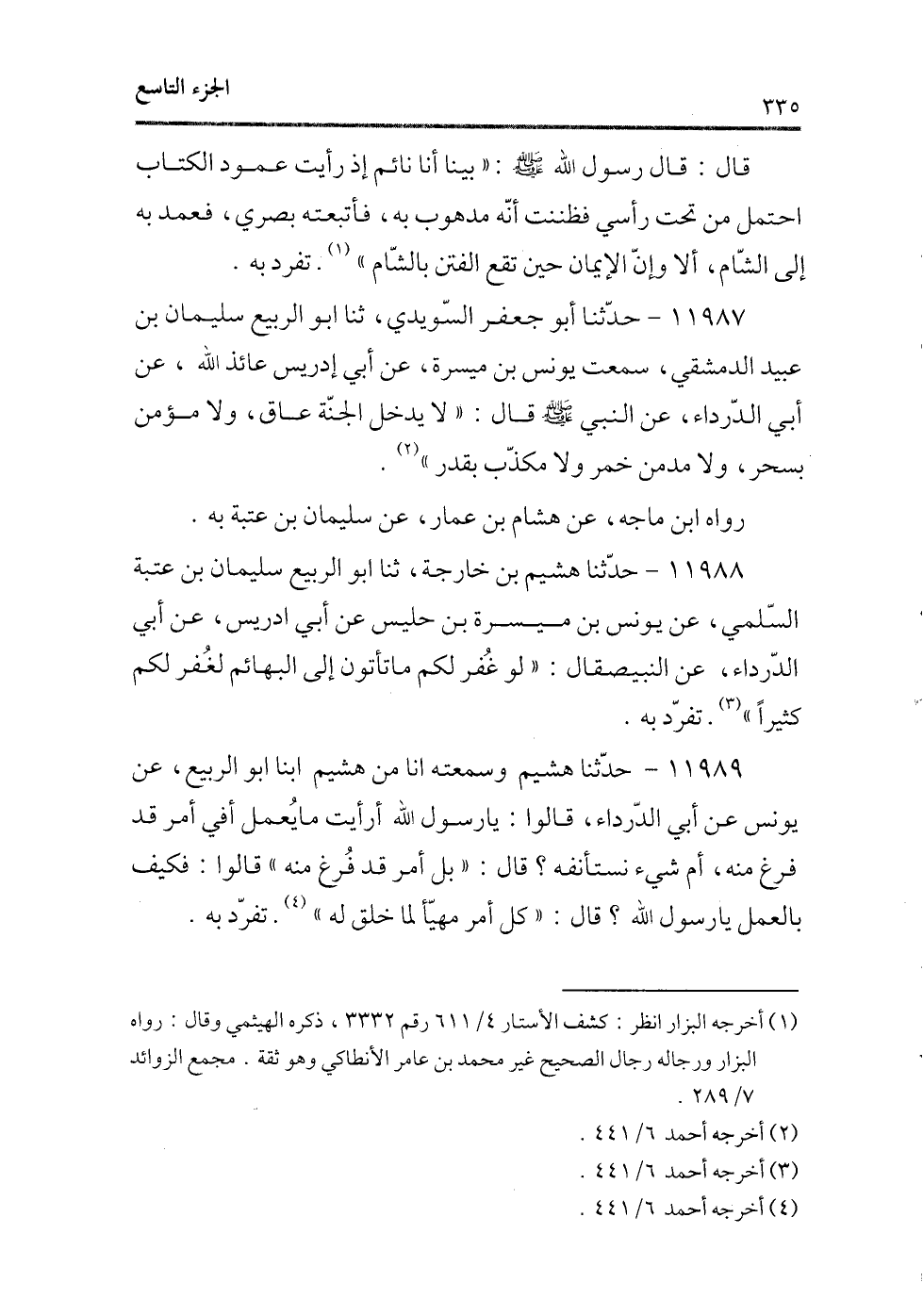 11988 - حدثنا هشيم بن خارجة، ثنا أبو الربيع سليمان بن عتبة السلمى، عن يونس بن ميسرة بن حليس عن أبى إدريس، عن أبى الدرداء، عن النبيصقال: «لو غُفر لكم ما تأتون إلى البهائم لغُفر لكم كثيرًا» (¬2) . تفرد به.