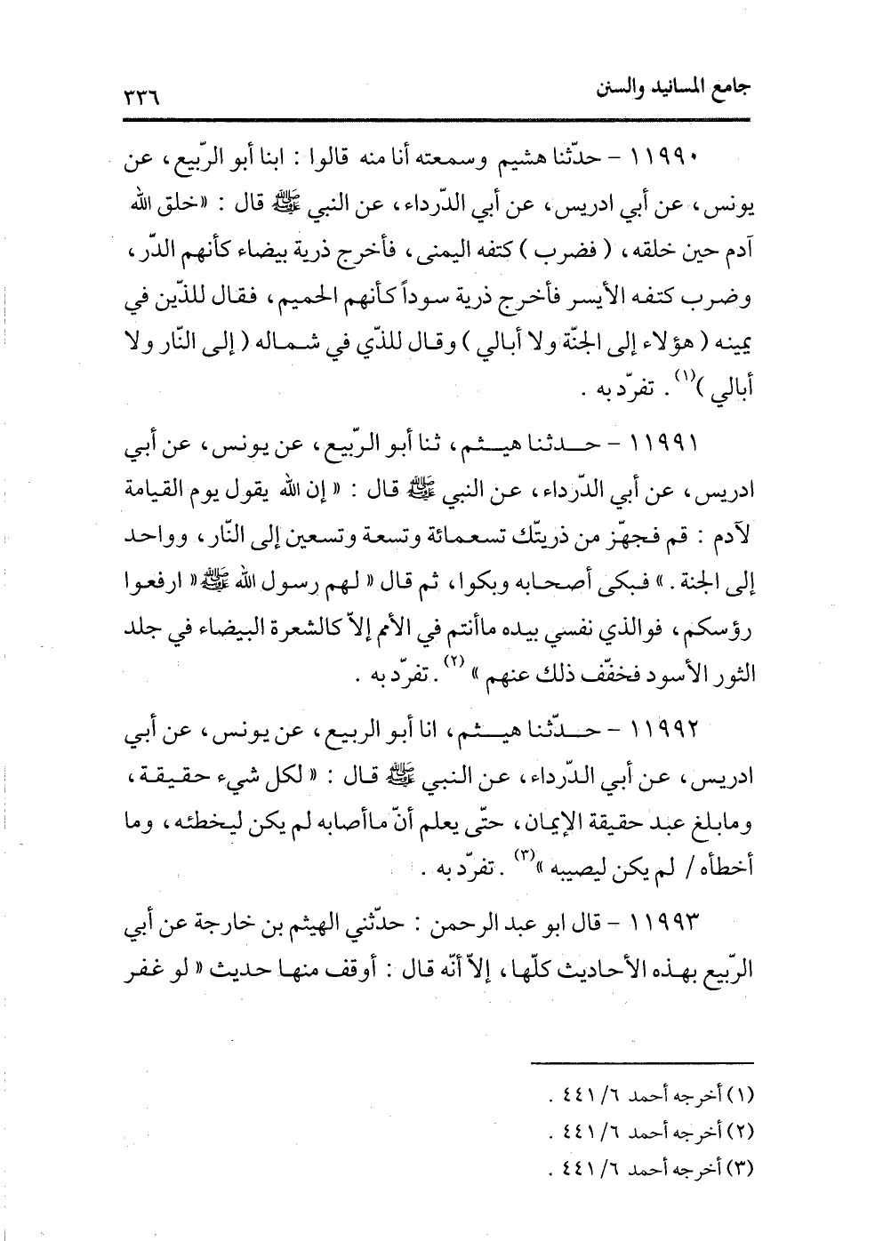 11990 - حدثنا هشيم وسمعته أنا منه قالوا: ابنا أبو الربيع، عن يونس، عن أبى إدريس، عن أبى الدرداء، عن النبى - صلى الله عليه وسلم - قال: «خلق الله آدم حين خلقه، (فضرب) كتفه اليمنى، فأخرج ذرية بيضاء كأنهم الدر، وضرب كتفه الأيسر فأخرج ذرية سودًا كأنهم الحميم، فقال للذين في يمينه (هؤلاء إلى الجنّة ولا أبالى) وقال للذى فى شماله (إلى النار ولا أبالى) (¬1) . تفرد به.