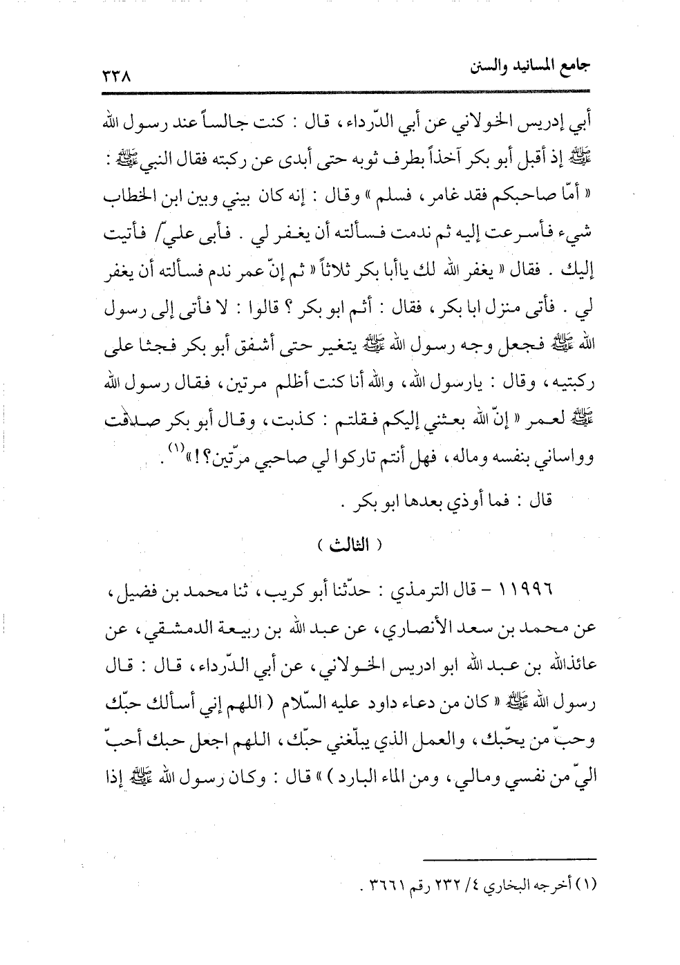 أبى إدريس الخولانى عن أبى الدرداء، قال: كنت جالسًا عند رسول الله - صلى الله عليه وسلم - إذ أقبل أبو بكر آخذًا بطرف ثوبه حتى أبدى عن ركبته فقال النبى - صلى الله عليه وسلم -: «أما صاحبكم فقد غامر، فسلم» وقال: إنه كان بينى وبين ابن الخطاب شىء فأسرعت إليه ثم ندمت فسألته أن يغفر لى. فأبى عليّ/ فأتيت إليك. فقال «يغفر الله لك يا أبا بكر ثلاثًا» ثم إن عمر ندم فسألته أن يغفر لى. فأتى منزل أبا بكر، فقال: أثم أبو بكر؟ قالوا: لا فأتى إلى رسول الله - صلى الله عليه وسلم - فجعل وجه رسول الله - صلى الله عليه وسلم - يتغير حتى أشفق أبو بكر فجثا على ركبتيه، وقال: يا رسول الله، والله أنا كنت أظلم مرتين، فقال رسول الله - صلى الله عليه وسلم - لعمر «إن الله بعثنى إليكم فقلتم: كذبت، وقال أبو بكر صدقت وواسانى بنفسه وماله، فهل أنتم تاركوا لى صاحبى مرتين؟ » (¬1) .