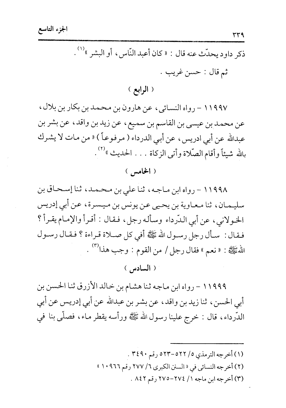 11997 - رواه النسائى، عن هارون بن محمد بن بكار بن بلال، عن محمد بن عيسى بن القاسم بن سميع، عن زيد بن واقد، عن بشر بن عبد الله عن أبى إدريس، عن أبى الدرداء (مرفوعًا) «من مات لا يشرك بالله شيئًا وأقام الصلاة وأتى الزكاة.. الحديث» (¬1) .