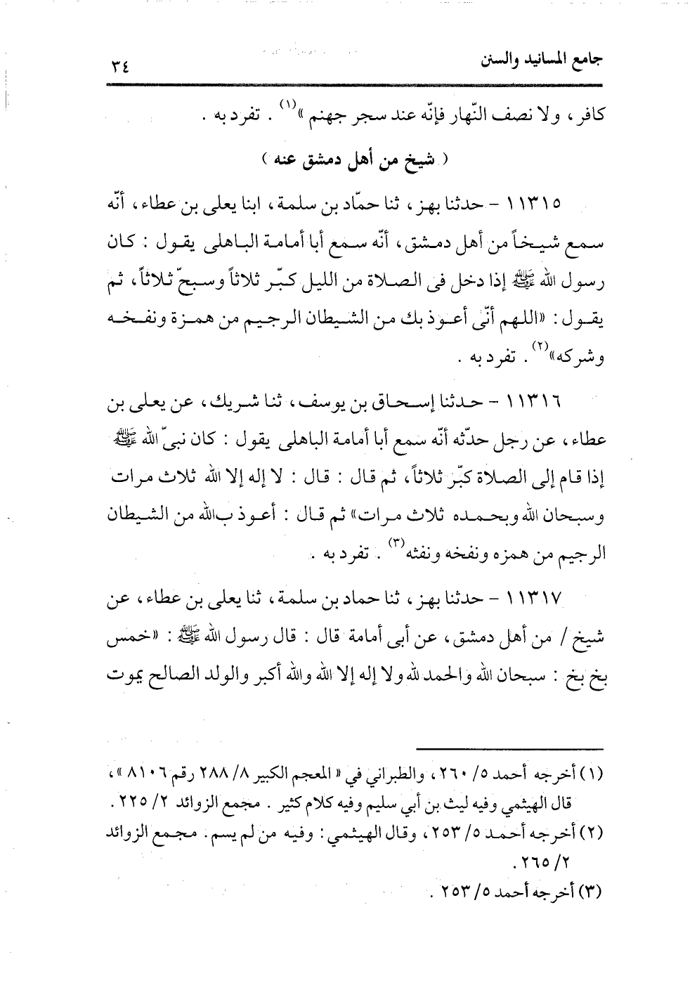 11315 - حدثنا بهز، ثنا حماد بن سلمة، ابنا يعلى بن عطاء، أنه سمع شيخاً من أهل دمشق، أنه سمع أبا أمامة الباهلى يقول: كان رسول الله - صلى الله عليه وسلم - إذا دخل فى الصلاة من الليل كبّر ثلاثاً وسبح ثلاثاً، ثم يقول: «اللهم أنّى أعوذ بك من الشيطان الرجيم من همزة ونفخه وشركه» (¬1) . تفرد به.