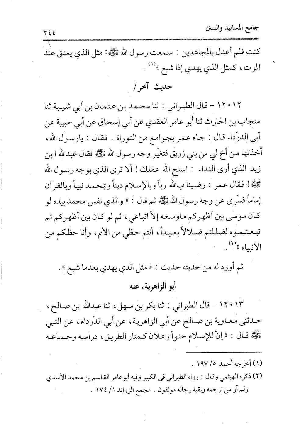 12013 - قال الطبرانى: ثنا بكر بن سهل، ثنا عبد الله بن صالح، حدثنى معاوية بن صالح عن أبى الزاهرية، عن ابى الدرداء، عن النبى - صلى الله عليه وسلم - قال: «إن للإسلام حنوًا وعلان كمنار الطريق، دراسة وجماعة