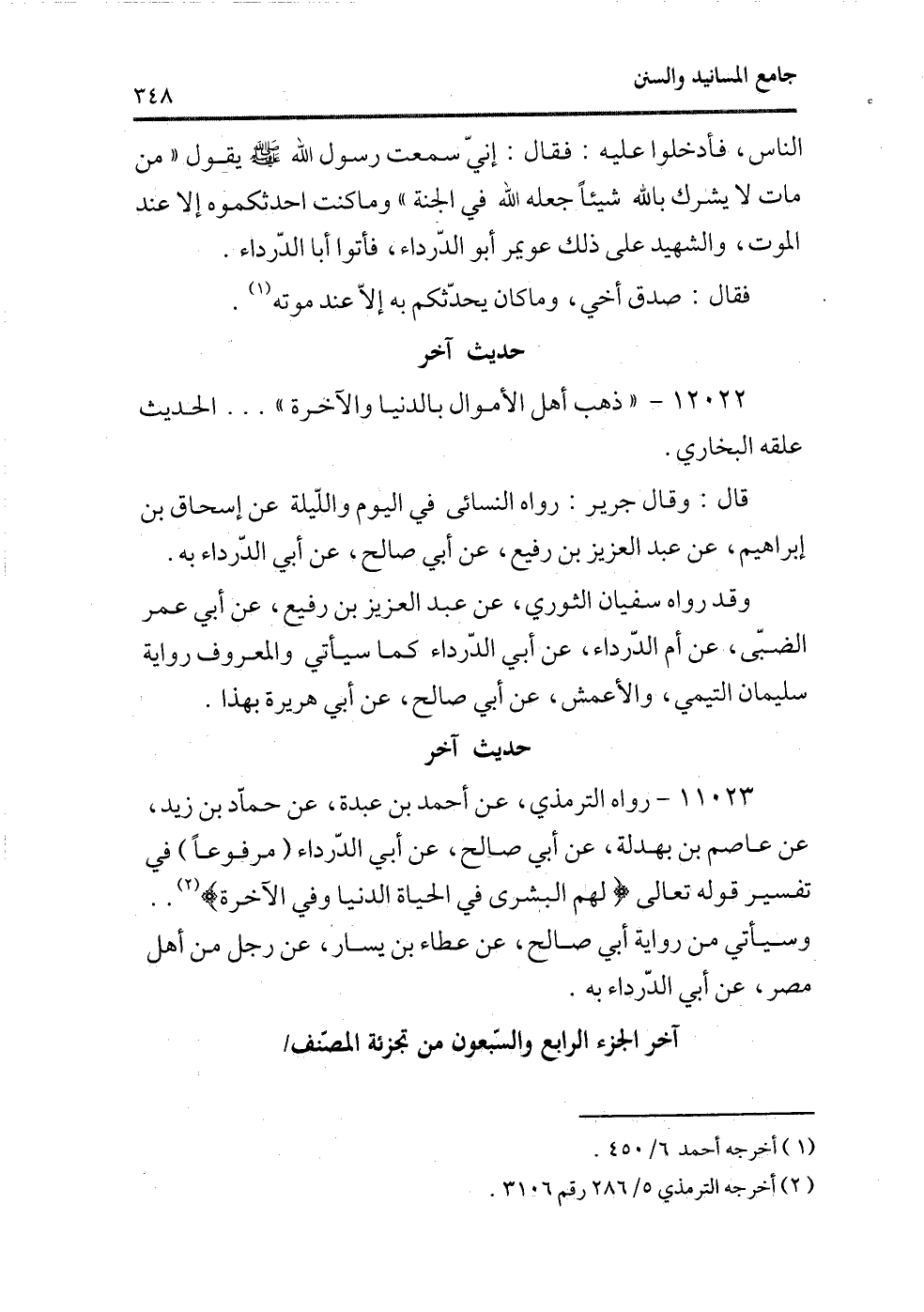 قال: وقال جرير: رواه النسائى فى اليوم والليلة عن إسحاق بن إبراهيم، عن عبد العزيز بن رفيع، عن أبى صالح، عن أبى الدرداء به.