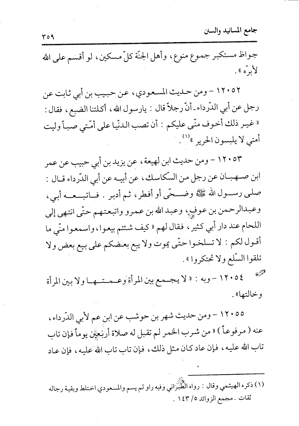 12052 - ومن حديث المسعودى، عن حبيب بن أبى ثابت عن رجل عن أبى الدرداء ـ أن رجلاً قال: يا رسول الله، أكلتنا الضبع، فقال: «غير ذلك أخوف منى عليكم: أن تصب الدنيا على أمتى صبًا وليت أمتى لا يلبسون الحرير» (¬1) .