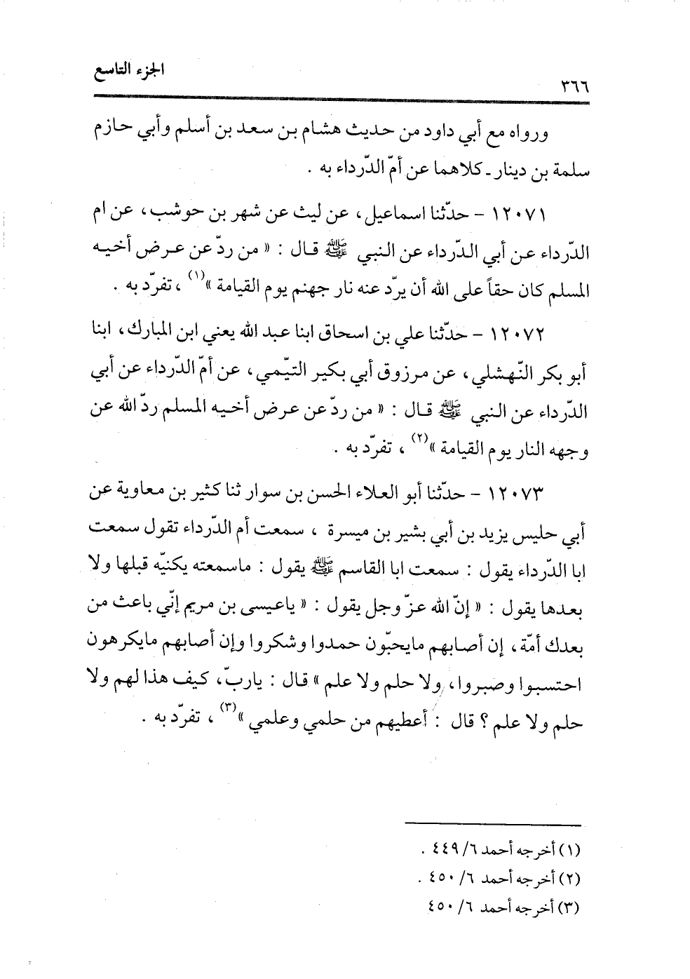 12071 - حدثنا إسماعيل، عن ليث عن شهر بن حوشب، عن أم الدرداء عن أبى الدرداء عن النبى - صلى الله عليه وسلم - قال: «من رد عن عرض أخيه المسلم كان حقًا على الله أن يرد عنه نار جهنم يوم القيامة» (¬1) ، تفرد به.