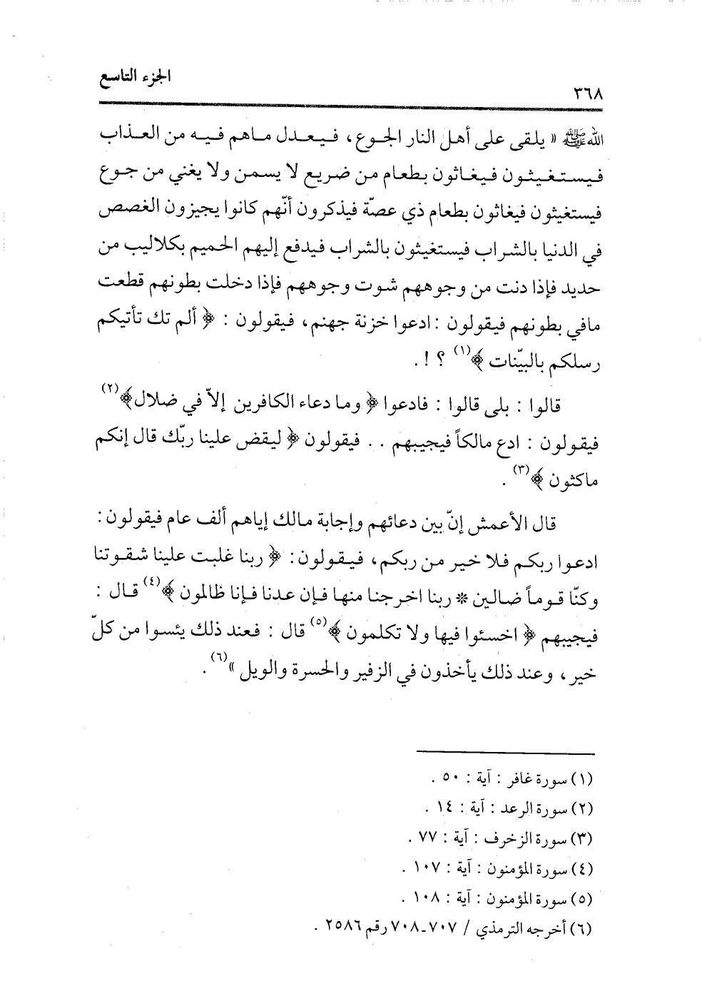 الله - صلى الله عليه وسلم - «يلقى على أهل النار الجوع، فيعدل ما هم فيه من العذاب فيستغيثون فيغاثون بطعام من ضريع لا يسمن ولا يغنى من جوع فيستغيثون فيغاثون بطعام ذى عصة فيذكرون أنهم كانوا يجيزون الغصص فى الدنيا بالشراب فيستغيثون بالشراب فيدفع إليهم الحميم بكلاليب من حديد فإذا دنت من وجوههم شوت وجوههم فإذا دخلت بطونهم قطعت ما فى بطونهم فيقولون: ادعو خزنة جهنم، فيقولون: {أَوَلَمْ تَكُ تَأْتِيكُمْ رُسُلُكُمْ بِالْبَيِّنَات} (¬1) ؟!.