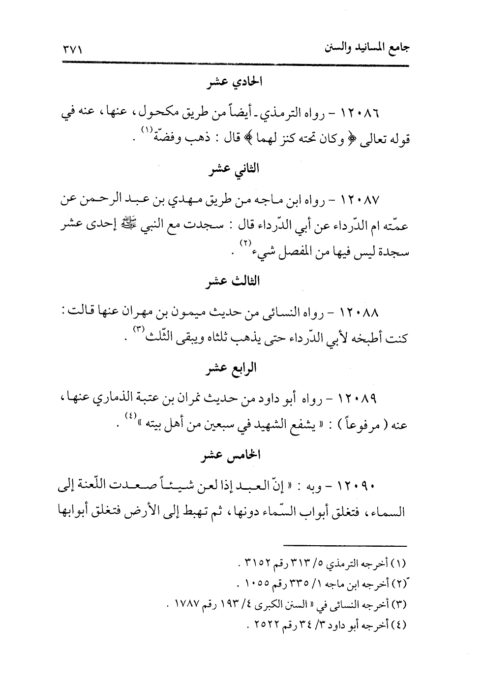 12087 - رواه ابن ماجه من طريق مهدى بن عبد الرحمن عن عمته أم الدرداء عن أبى الدرداء قال: سجدت مع النبى - صلى الله عليه وسلم - إحدى عشر سجدة ليس فيها من المفصل شىء (¬2) .