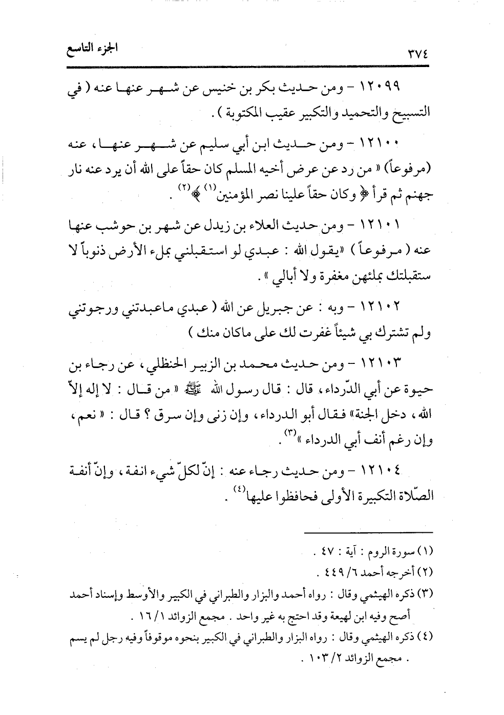 12100 - ومن حديث ابن أبى سليم عن شهر عنها، عنه (مرفوعًا) «من رد عن عرض أخيه المسلم كان حقًا على الله أن يرد عنه نار جهنم ثم قرأ {وَكَانَ حَقّاً عَلَيْنَا نَصْرُ الْمُؤْمِنِينَ} (¬1) » (¬2) .